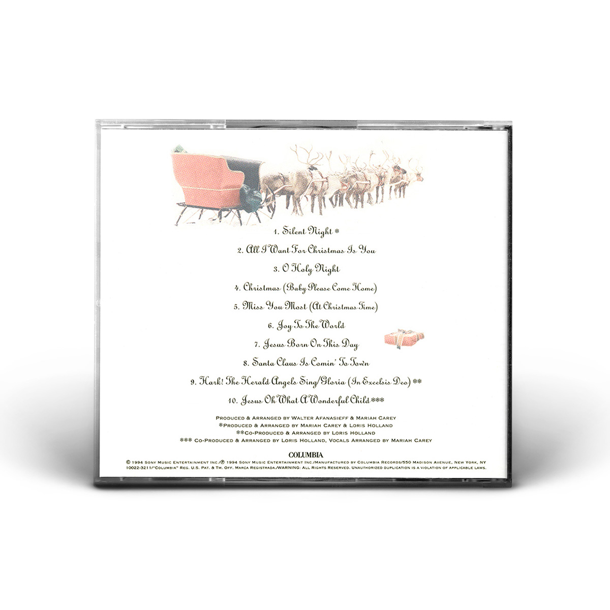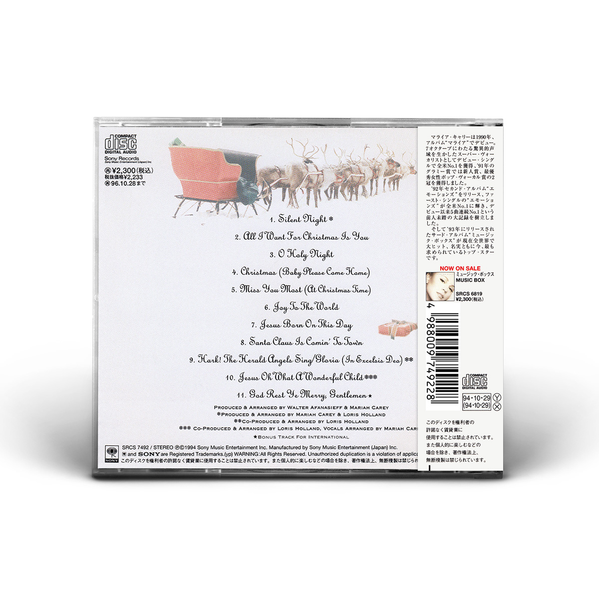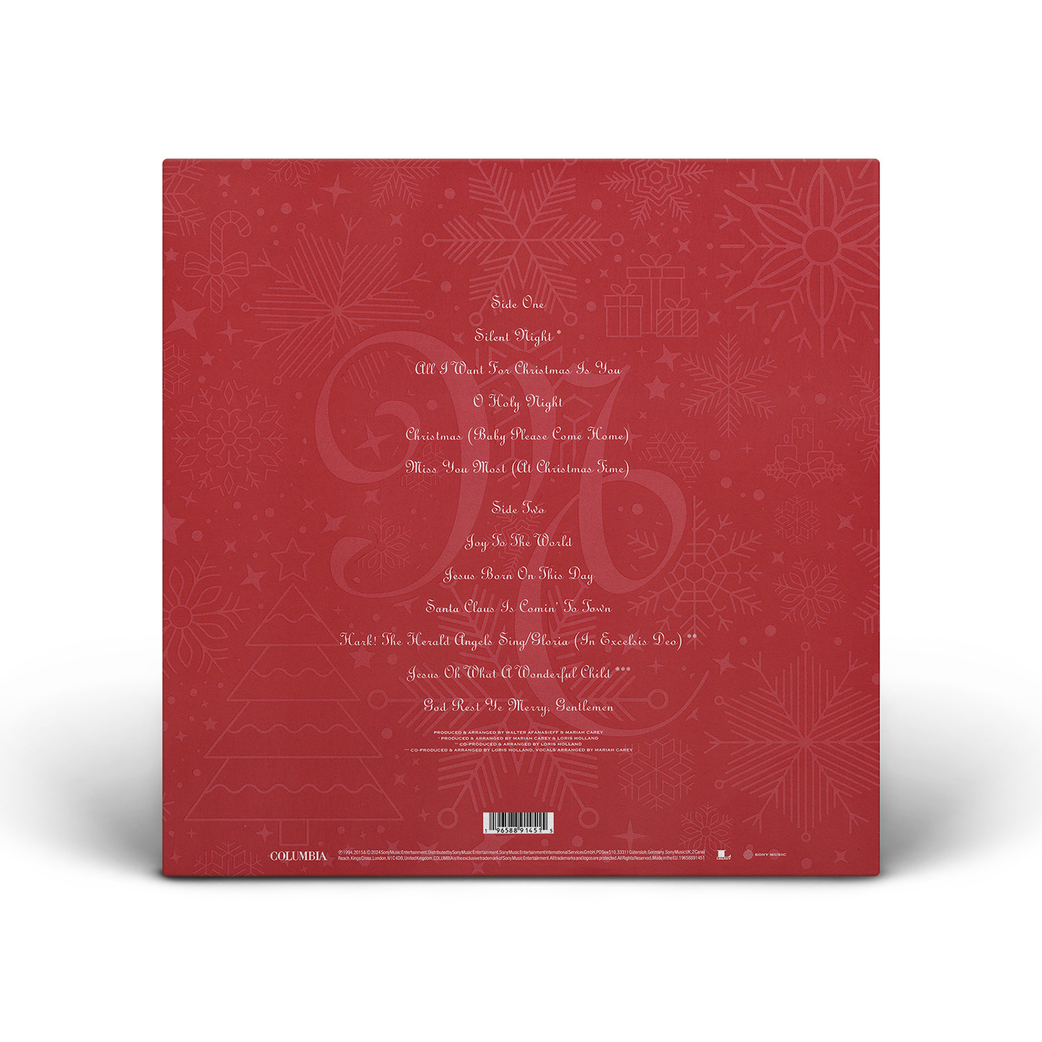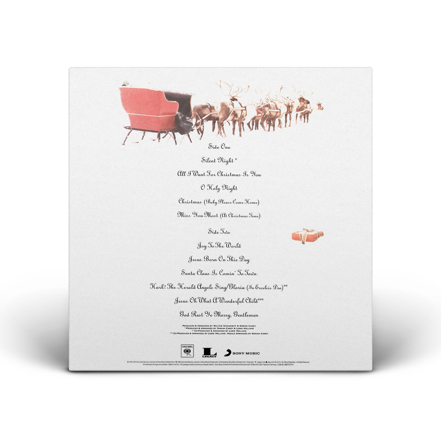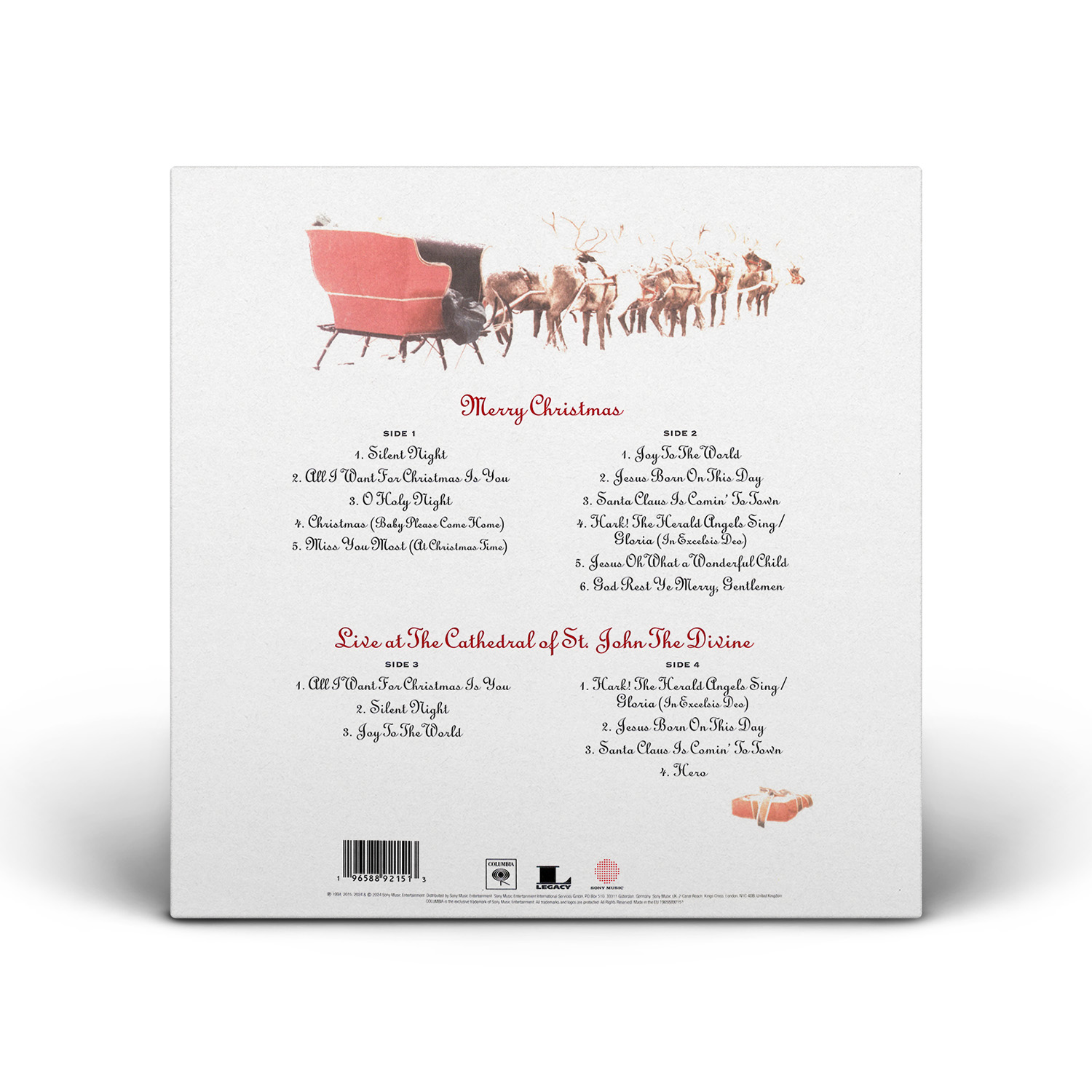 Merry Christmas was originally available on CD, Cassette and MiniDisc. International editions of the album include the bonus track “God Rest Ye Merry, Gentlemen.” In Europe, Merry Christmas was available on CD, Cassette, MiniDisc and 12" Vinyl.
