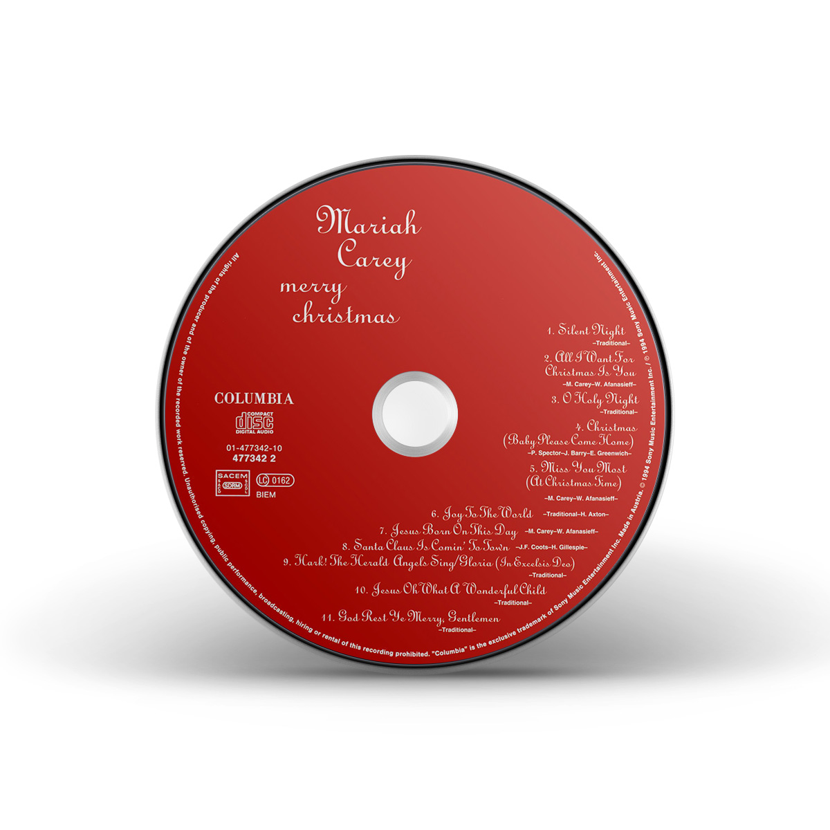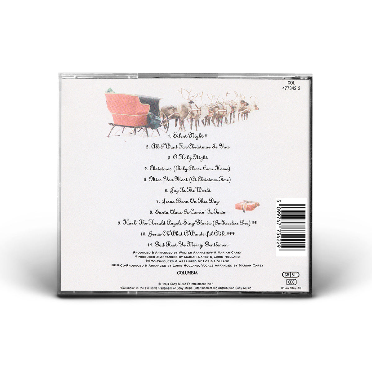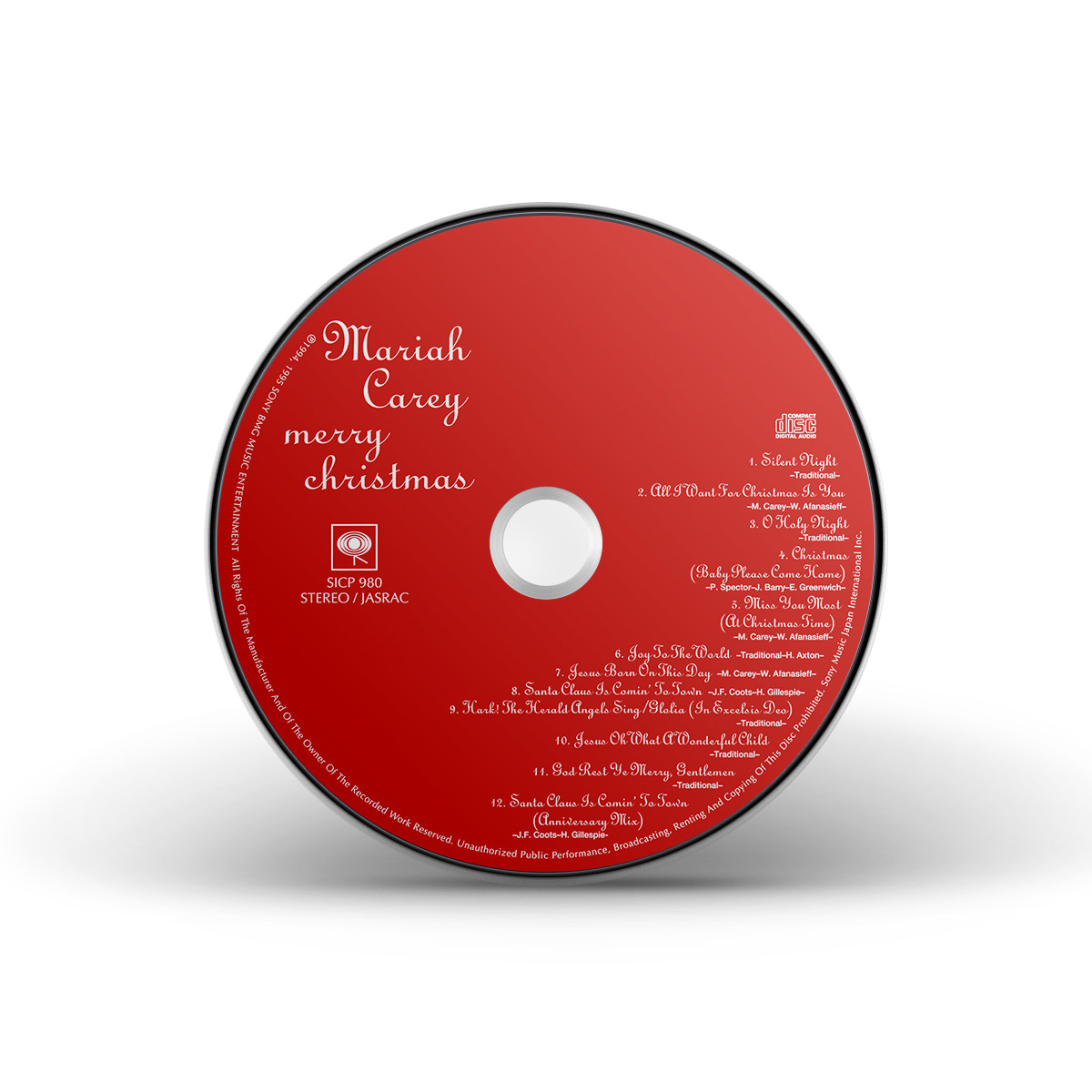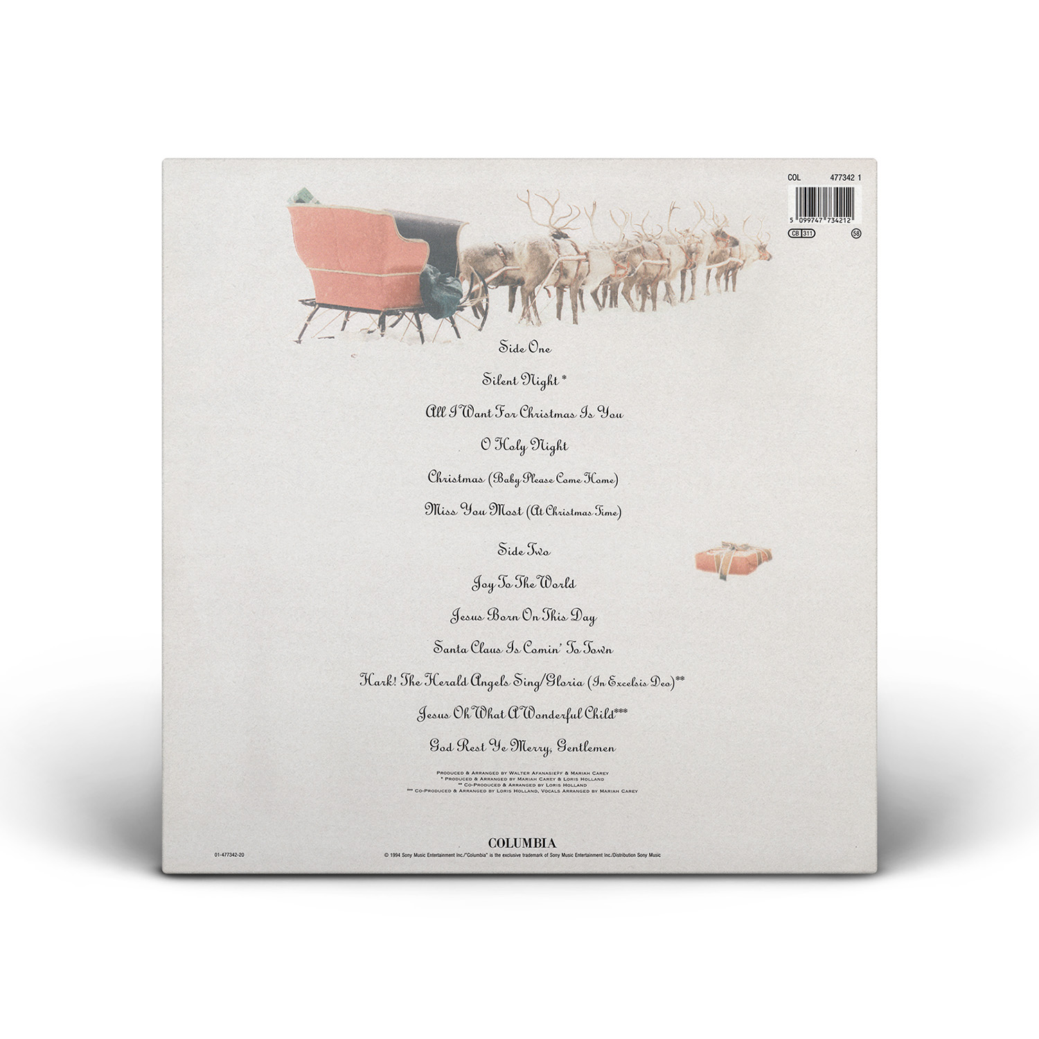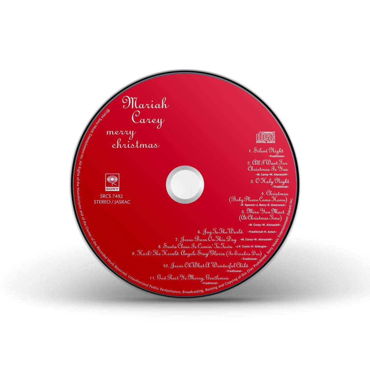 Merry Christmas was originally available on CD, Cassette and MiniDisc. International editions of the album include the bonus track “God Rest Ye Merry, Gentlemen.” In Europe, Merry Christmas was available on CD, Cassette, MiniDisc and 12" Vinyl.