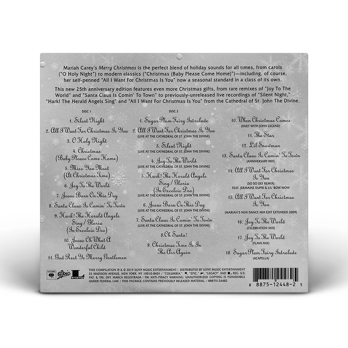 On November 1, 2019, to commemorate the album's 25th anniversary, the Deluxe Anniversary Edition of Merry Christmas was released including a bonus CD with previously unreleased live performances of six of the album's tracks, recorded live at the St. John The Divine Cathedral in New York in 1994, as well as three songs from the 2010 Merry Christmas II You album, remixes, “The Star” (from The Star original motion picture soundtrack), “Lil Snowman” (from the All I Want For Christmas Is You original motion picture soundtrack) and a new introlude of “Sugar Plum Fairy.”