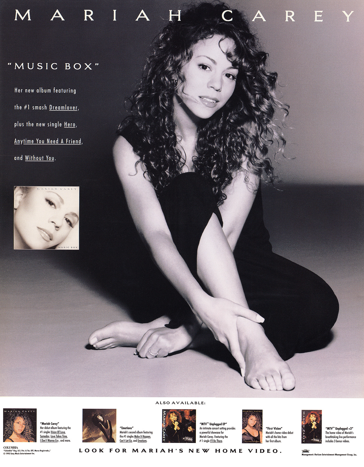 Music Box includes a cover of the song “Without You,” originally recorded by Badfinger in 1970 and made popular by Harry Nilsson in 1971. “I used to love the song when I was a little girl and I remember that it always made me cry and I always thought it was such a beautiful song,” Mariah said. “I heard it again when I was in a restaurant and I was like ‘I love this song, this is such a great song, I haven't heard it in so long’ and I just decided that I wanted to cover it.” In the United States, it was released on January 25, 1994, as a double-sided single with “Never Forget You,” written by Mariah and Kenny “Babyface” Edmonds. The single peaked at number three on the Billboard Hot 100 chart and spent thirteen weeks in the Top 10. “Without You” enjoyed a massive success across Europe, becoming Mariah's first number-one single in the United Kingdom and topping the singles charts in Austria, Belgium, Germany, Iceland, Ireland, the Netherlands, Scotland, Sweden and Switzerland.