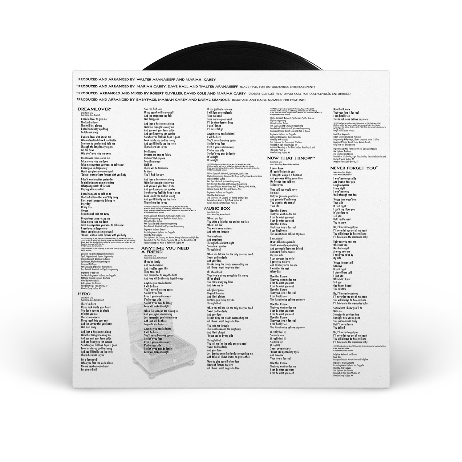 Mariah wrote most of the album with Walter Afanasieff and David Cole & Robert Clivillés. “Walter is my favorite person to work with because we really know each other very well musically,” Mariah explained. “He lives in San Francisco and I live in New York, so he would do a rough version of the track and send it to me and I would do all the vocals like that. I felt really free to do what I wanted on this album because I didn't have anyone over my shoulder the whole time. It was just like: ‘This is my album, I'm doing it this way.’ I felt like it was the next step for me to really be alone in the studio for most of the album. It really helped me get myself out there. It helped me to get my personality across, and get the emotions I was feeling at the time of each song out a bit more. We have this connection where I'll sing what I'm hearing and he'll start playing, and usually it's what I'm hearing in my head. Walter really tries to let me lead. He knows it's important to me to let the melodies I have develop.”