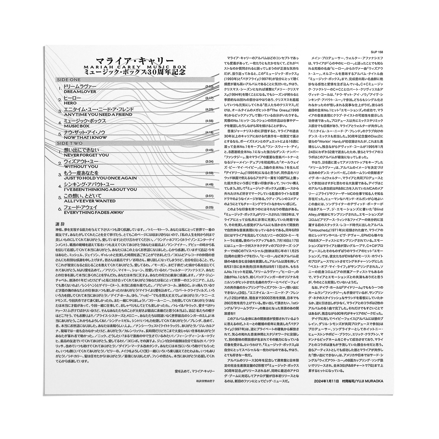 In 2023, to commemorate the 30th anniversary of Music Box, the digital version of the album was updated on September 8 with fifteen additional bonus tracks including two previously-unreleased songs: “Workin' Hard,” and a cover of the 1939 song “My Prayer.” Previously-unreleased bonus tracks also include the 2009 version of “Hero,” the live versions of “Dreamlover” and “Without You” from Mariah's appearances on Top Of The Pops, an extended version of “All I Live For,” from Mariah's 2020 release The Rarities, an acapella version of the album's title track, new remixes of “I've Been Thinking About You” and “Workin' Hard,” an extended version of “Anytime You Need A Friend,” as well as remastered HQ audio from Mariah's 1993 concert at Schenectady's Proctor's Theatre. This expanded version of Music Box was also released on 3XCD and 4XLP.