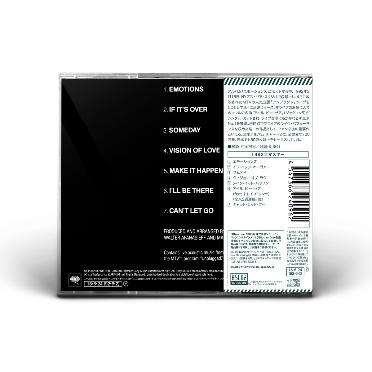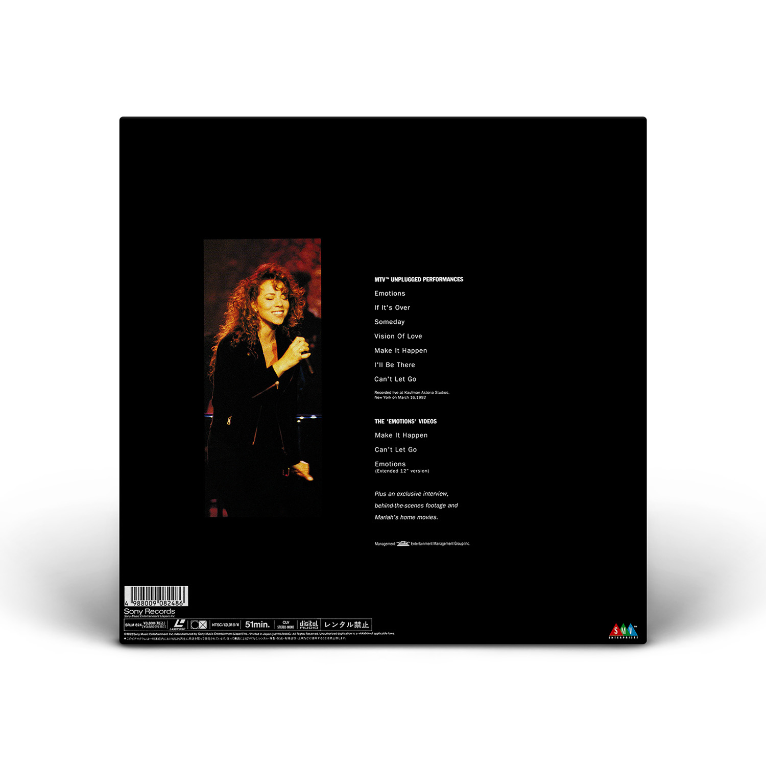 MTV Unplugged was also released on VHS on June 2, 1992, under the title MTV Unplugged +3. The home video includes the whole concert, three music videos (“Make It Happen,” “Can't Let Go” and the 12" Club Mix of “Emotions”), an exclusive interview, behind-the-scenes footage and Mariah's home movies. MTV Unplugged +3 topped Billboard's Video Chart and was certified Platinum by the Recording Industry Association Of America on November 1, 1996. The home video was released on DVD on September 12, 2006, and digitally on December 7, 2021.