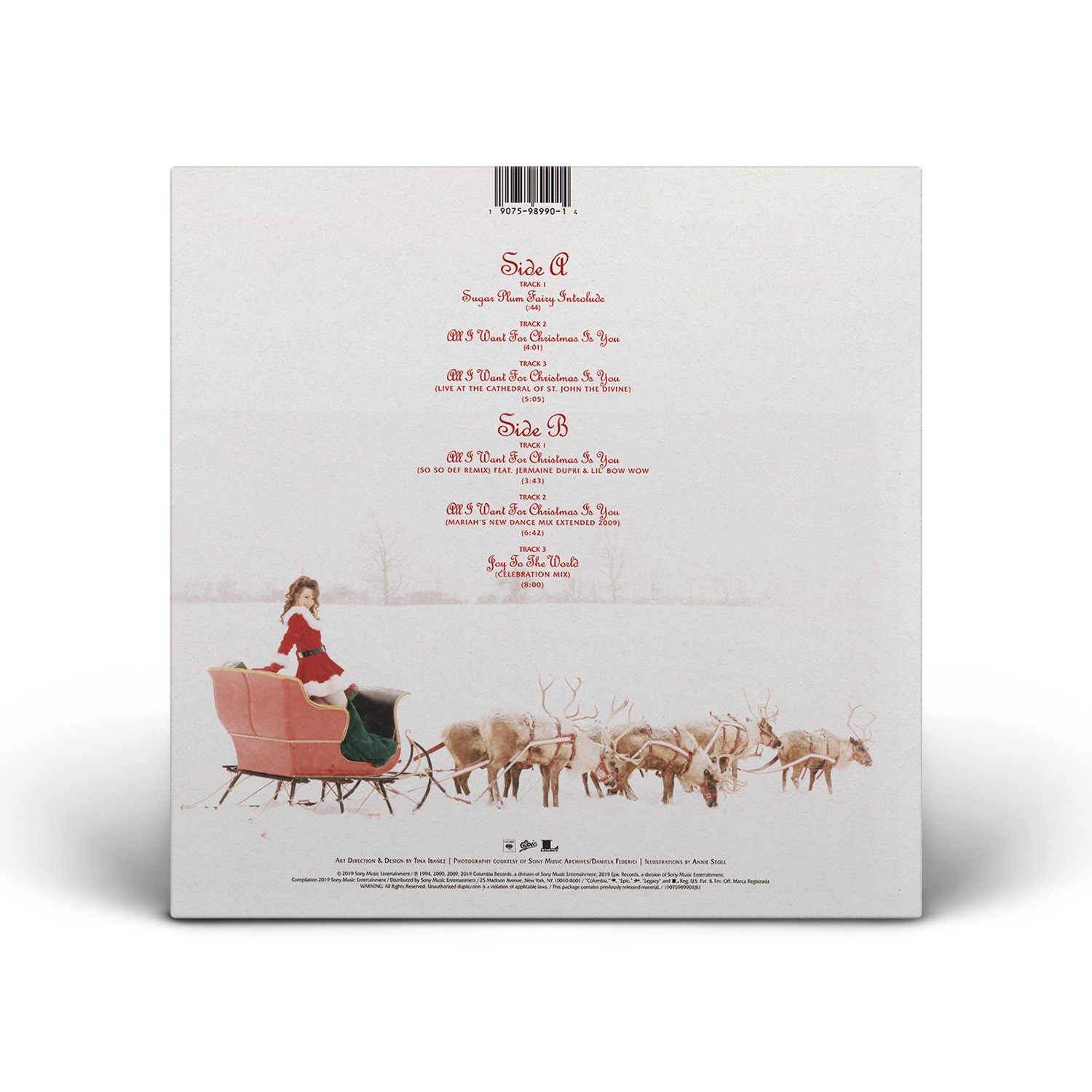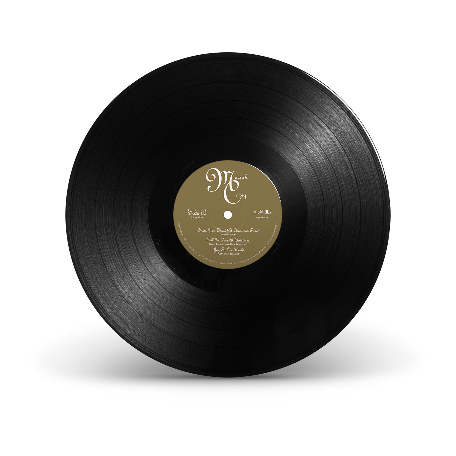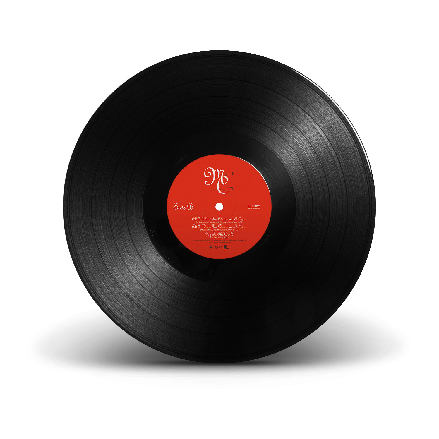 The limited edition 12" Vinyl pressing of the “All I Want For Christmas Is You” single includes two bonus tracks: “Oh Santa!” featuring Ariana Grande and Jennifer Hudson from Mariah Carey's Magical Christmas Special; and the Video Version of “Miss You Most (At Christmas Time).” An extend 12" Vinyl single includes three additional bonus songs: “The Star,” from The Star original motion picture soundtrack; “Fall In Love at Christmas,” with Khalid and Kirk Franklin; and the Club Mix of “Joy To The World.”