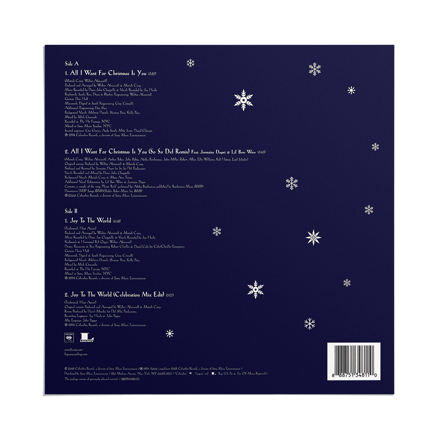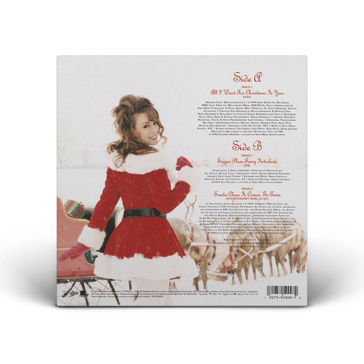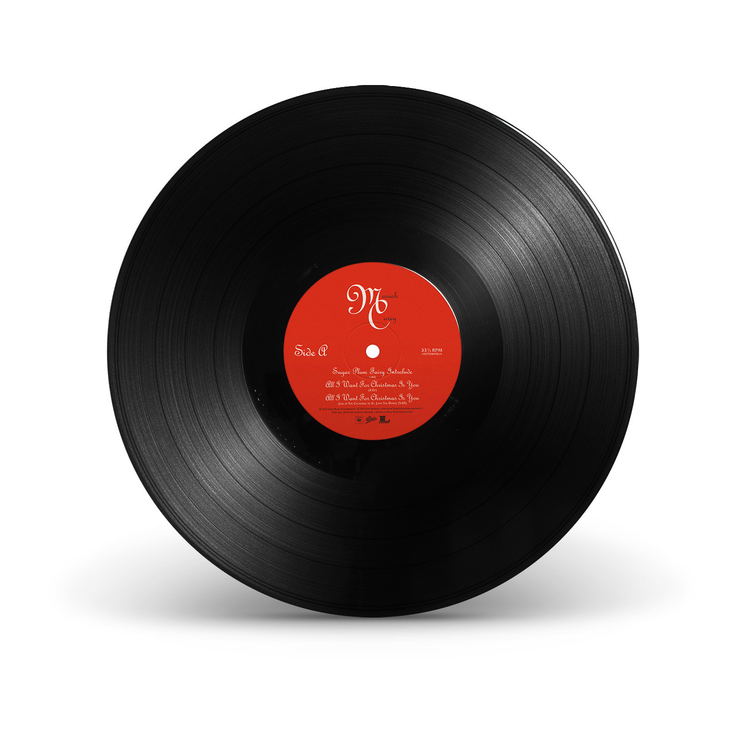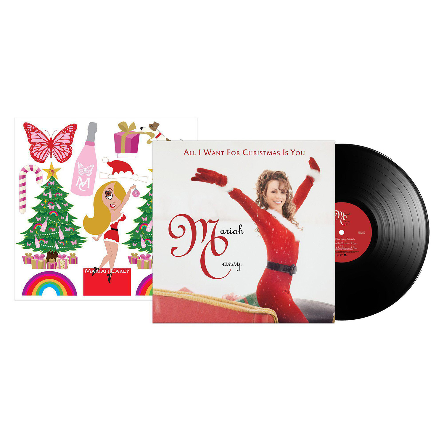 The limited edition 12" Vinyl pressing of the “All I Want For Christmas Is You” single includes two bonus tracks: “Oh Santa!” featuring Ariana Grande and Jennifer Hudson from Mariah Carey's Magical Christmas Special; and the Video Version of “Miss You Most (At Christmas Time).” An extend 12" Vinyl single includes three additional bonus songs: “The Star,” from The Star original motion picture soundtrack; “Fall In Love at Christmas,” with Khalid and Kirk Franklin; and the Club Mix of “Joy To The World.”