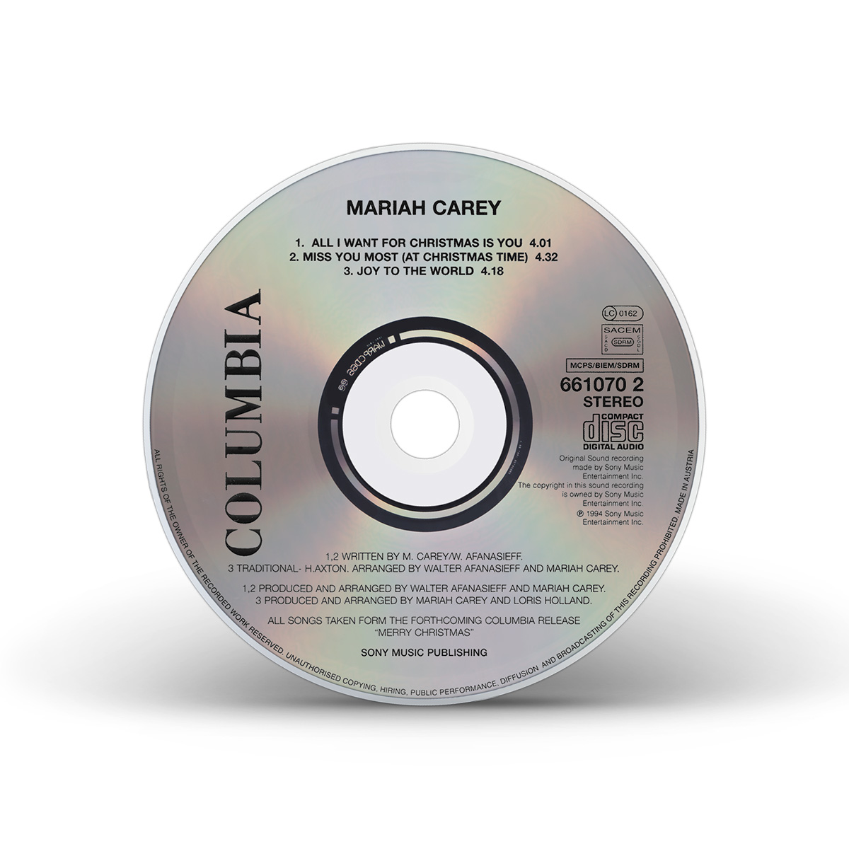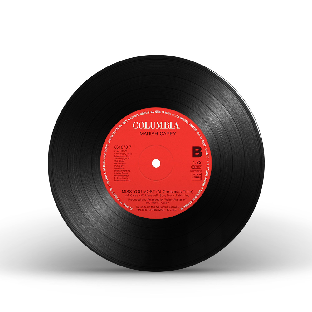 The European “All I Want For Christmas Is You” single, issued on CD and 7" Vinyl, includes “Miss You Most (At Christmas Time)” as the B-side. Two additional Maxi Singles were available, the first one including “Jesus Oh What A Wonderful Child” as the third track, and the second Maxi Single — a limited edition picture disc — includes “Silent Night.”