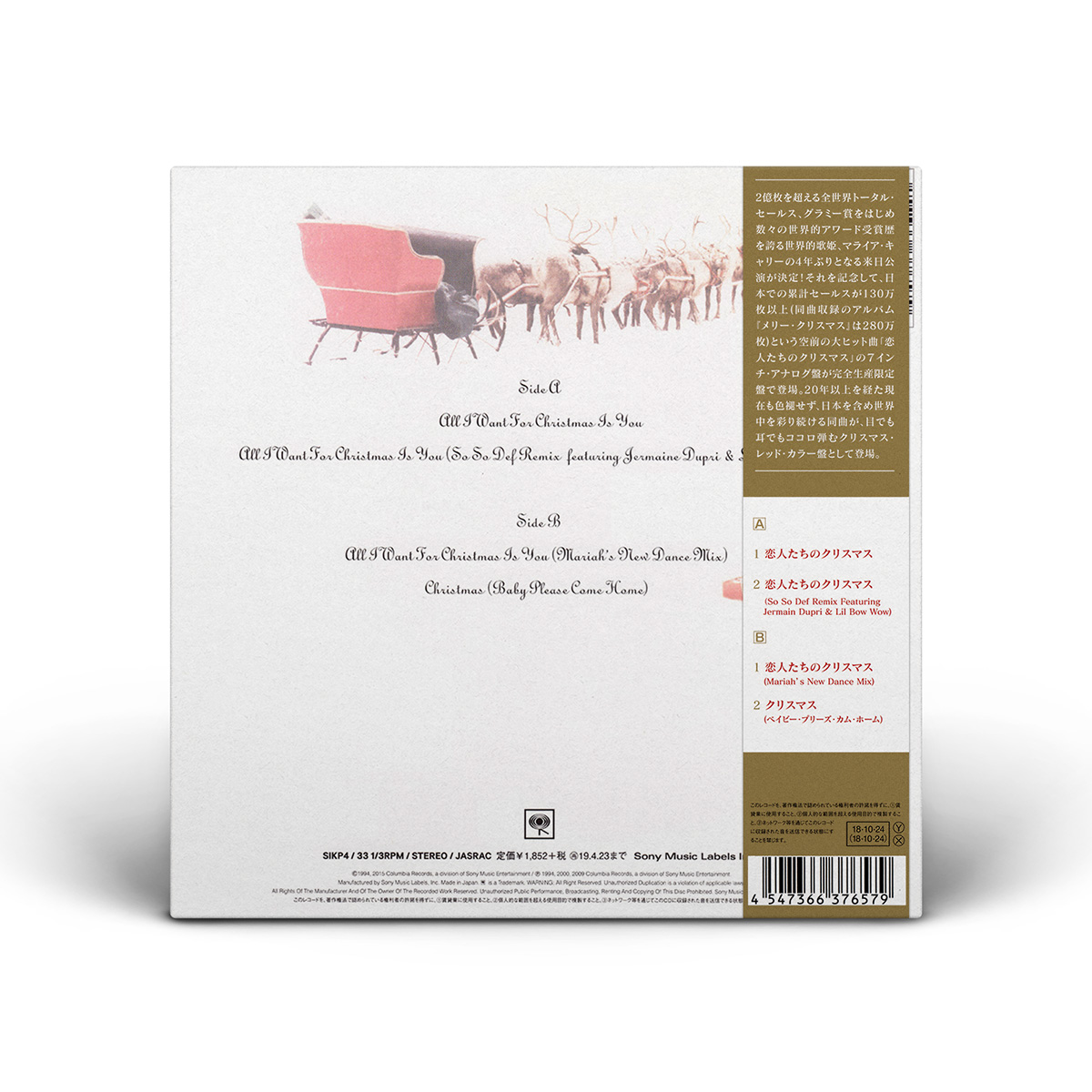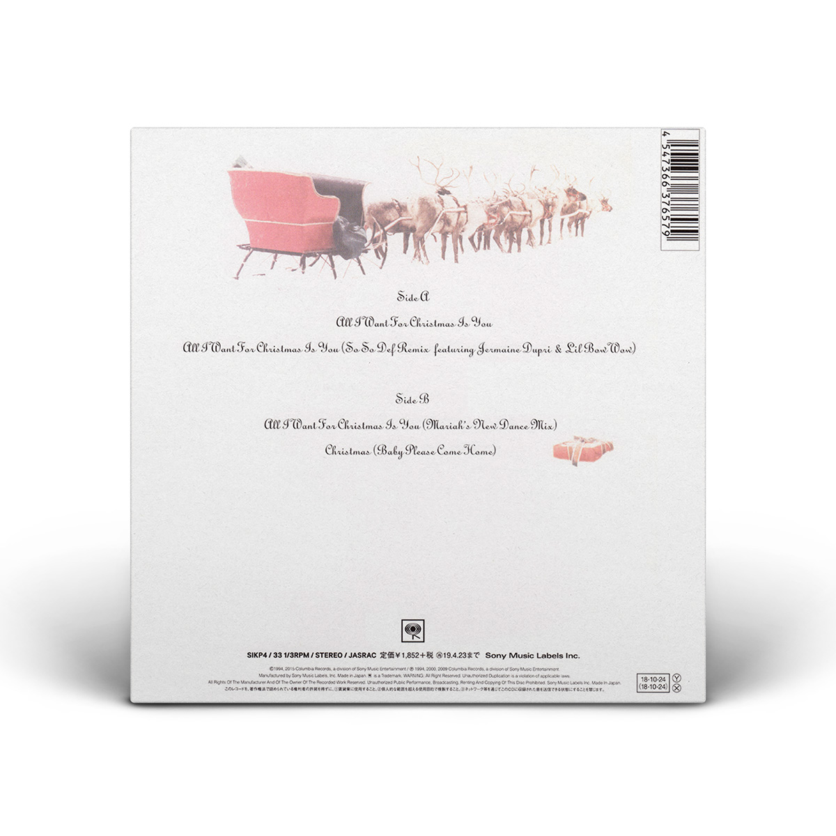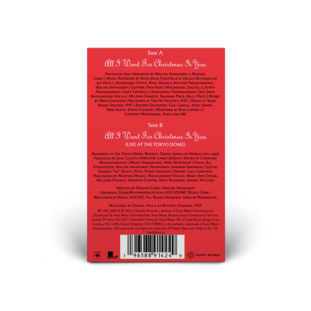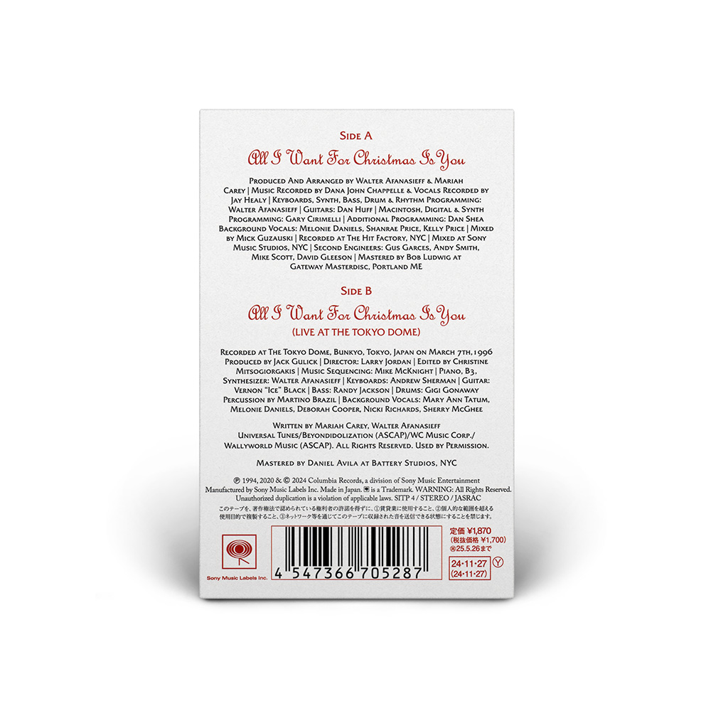 Both the Cassette and 7" Vinyl include “All I Want For Christmas Is You” and a bonus track: “Sleigh Ride” is included on the 7" vinyl, while the Cassette Single features the live version of “ All I Want For Christmas Is You” recorded live at the Tokyo Dome during Mariah's Daydream tour.