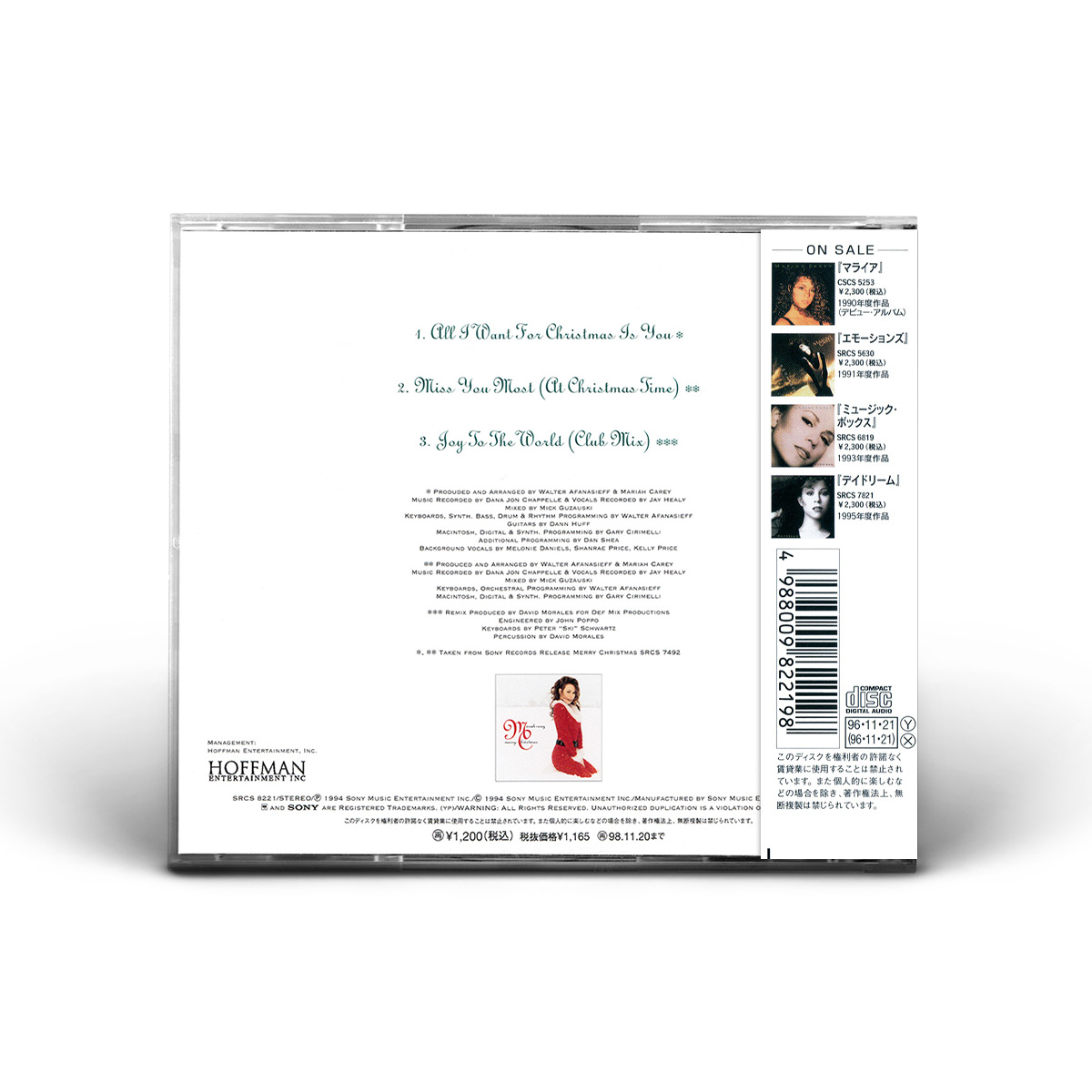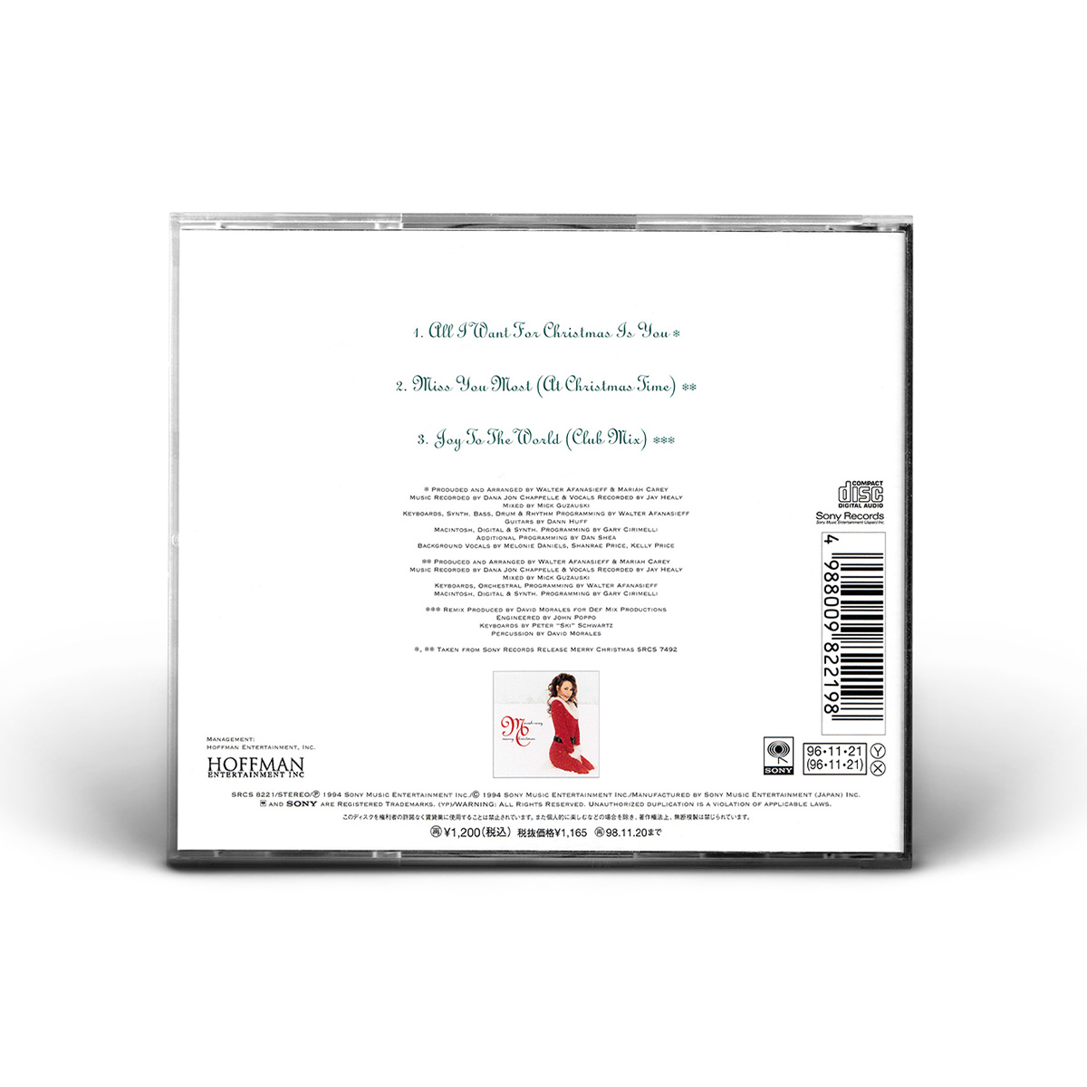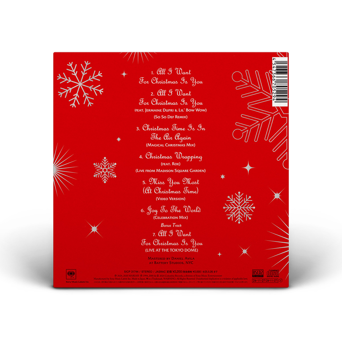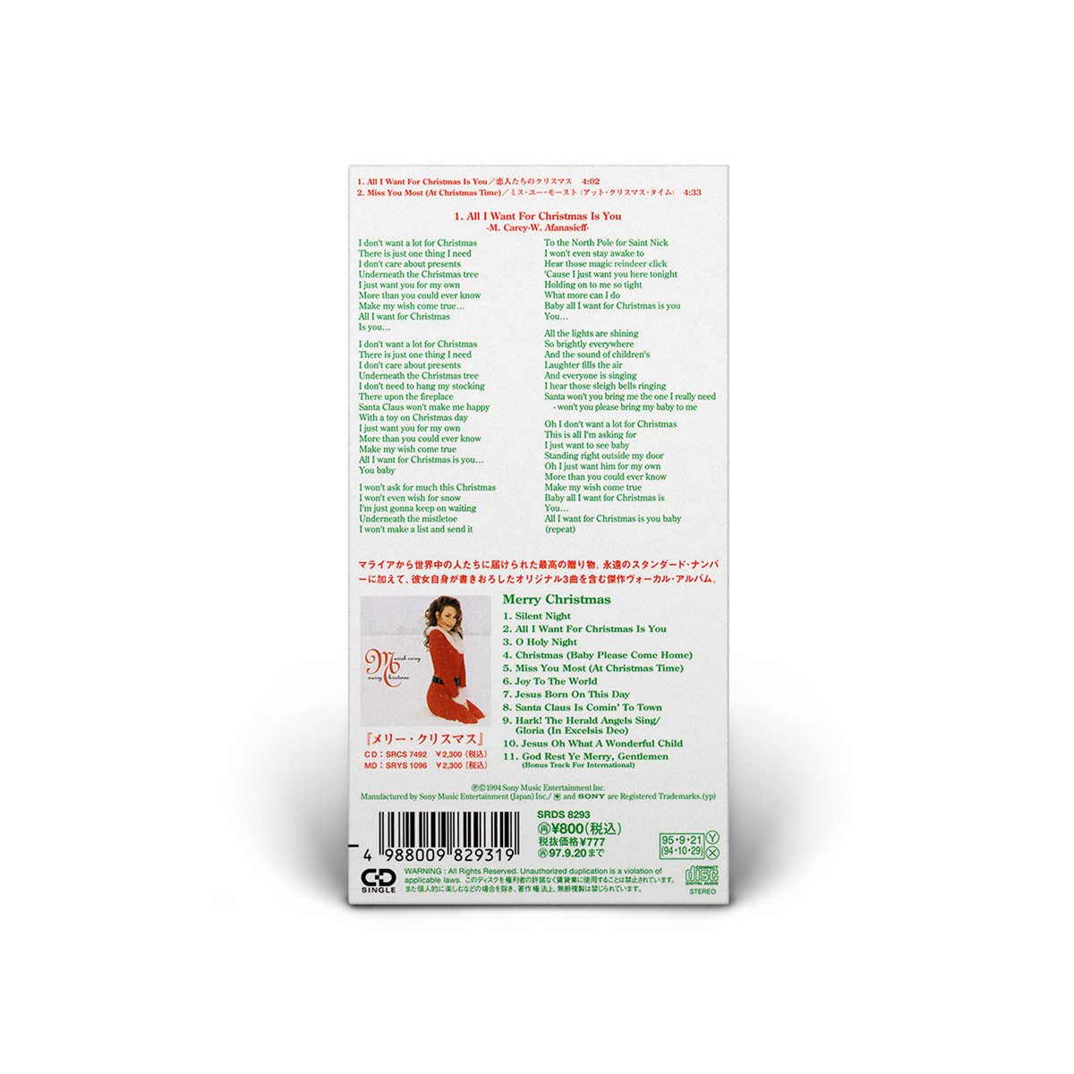 Both the Cassette and 7" Vinyl include “All I Want For Christmas Is You” and a bonus track: “Sleigh Ride” is included on the 7" vinyl, while the Cassette Single features the live version of “ All I Want For Christmas Is You” recorded live at the Tokyo Dome during Mariah's Daydream tour.