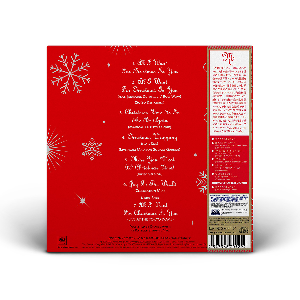 Sony Music Japan also issued two exclusive 30th anniversary releases: a CD single with the same track list as the international edition and a bonus track (the live version from the Tokyo Dome of “All I Want for Christmas Is You.”) but with different artwork housed in a 7" cardboard sleeve and with two bonus Christmas cards, and a limited edition white Cassette Single, including the album and live version of “All I Want for Christmas Is You.”