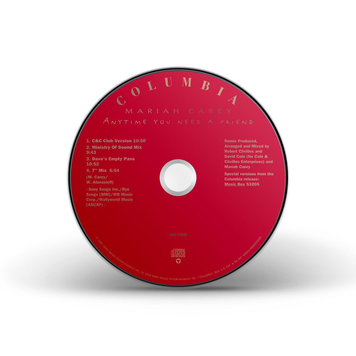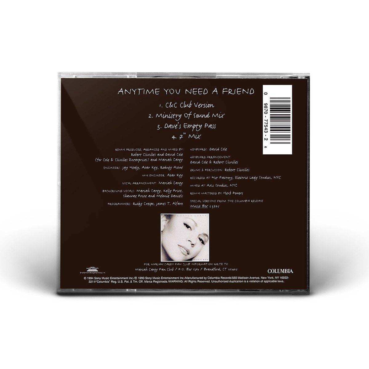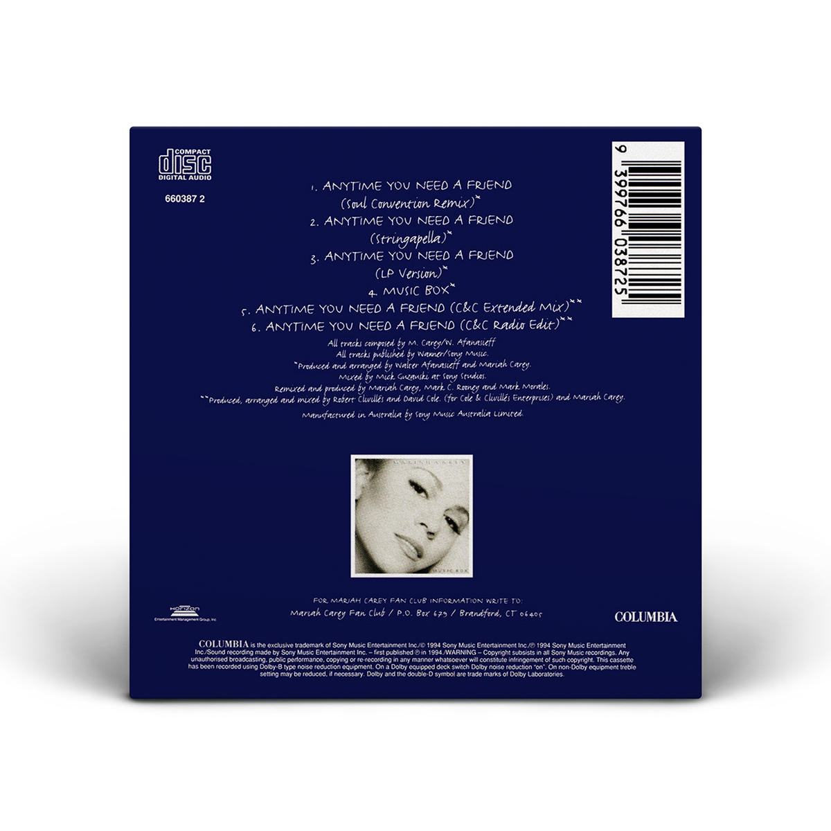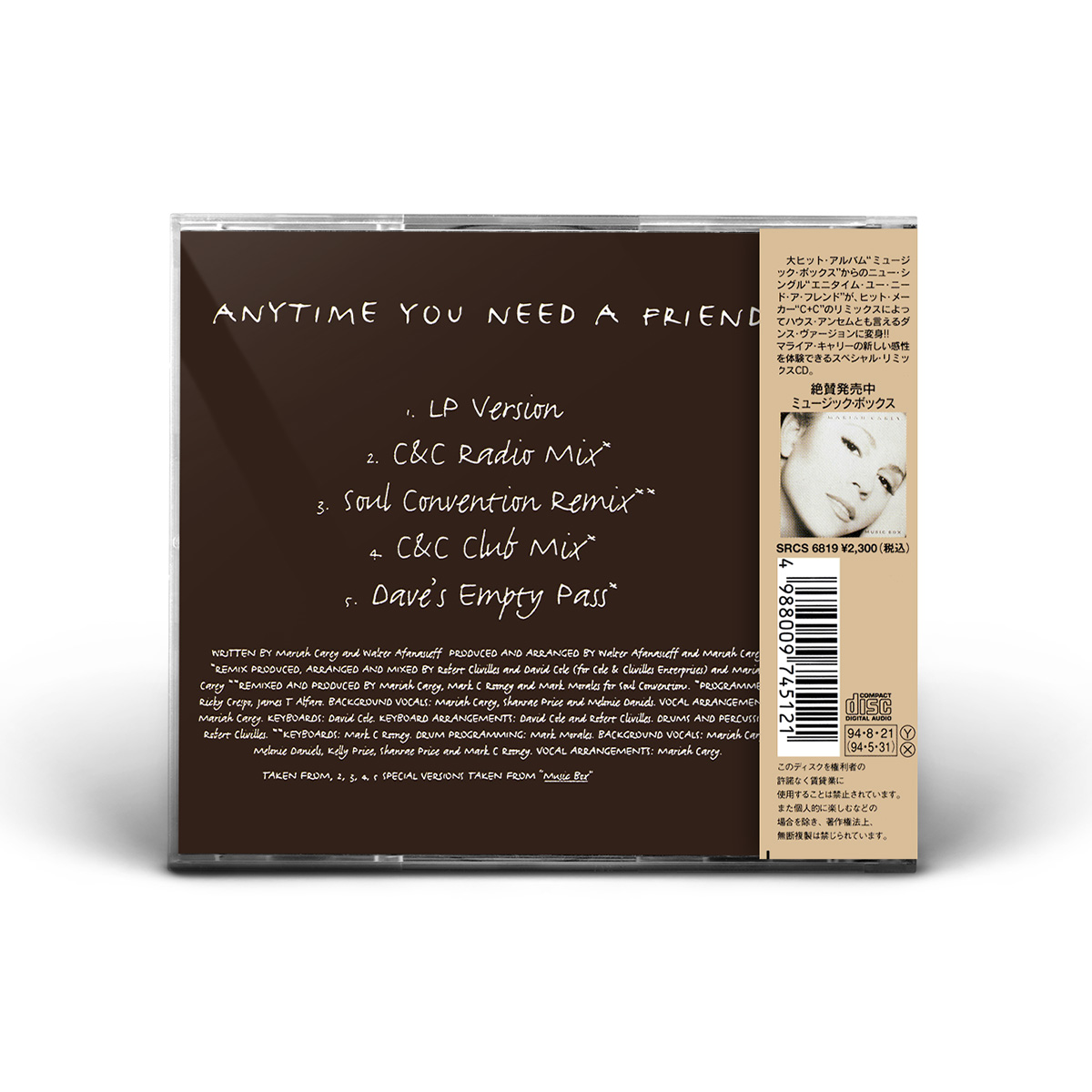 Sony Music Japan issued two “Anytime You Need A Friend” CDs. The 3" CD Single, released on July 21, 1994, includes “Music Box” as the B-side. A 5" CD Maxi Single became available on August 21, containing five versions of “Anytime You Need A Friend” (Album Version, C&C Radio Mix, Soul Convention Remix, C&C Club Mix and Dave's Empty Pass).