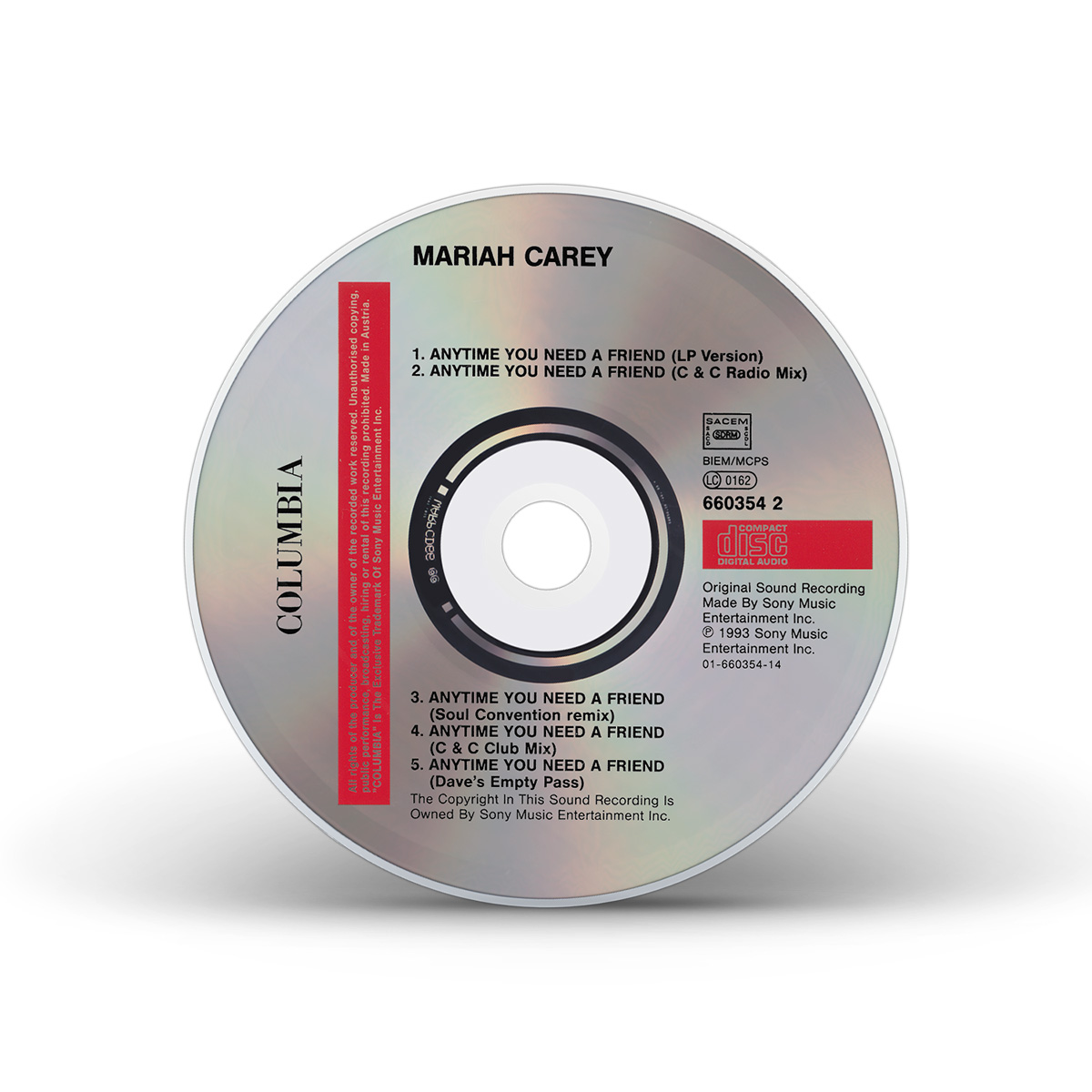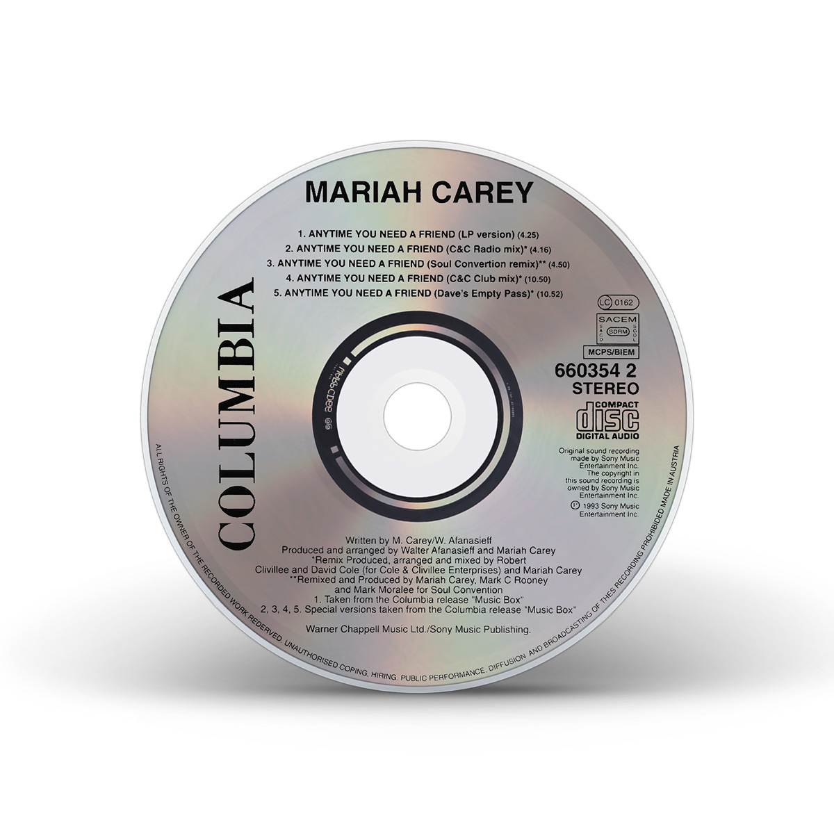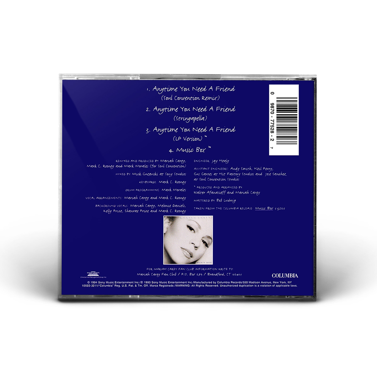 In the United States, the “Anytime You Need A Friend” Single was released on Cassette with two different covers, and includes the song “Music Box” as the B-side. The Cassette Maxi Single contains the Album Version of “Anytime You Need A Friend” and three remixes: C&C Extended Mix, C&C Radio Edit and Soul Convention Remix. There were two CD Maxi Singles available: CD 1 contains two remixes by Soul Convention (Soul Convention Remix and Stringapella), and the Album Version of “Anytime You Need A Friend” and “Music Box.” CD 2 includes four remixes by David Cole and Robert Clivillés: C&C Club Version, Ministry Of Sound Mix, Daves' Empty Pass and 7" Mix. “Anytime You Need A Friend” received a double 12" Vinyl release, including the album version of the song and four C&C remixes: All That And More Mix, Ministry Of Sound Mix, Boriqua Tribe Mix and C&C Dub.