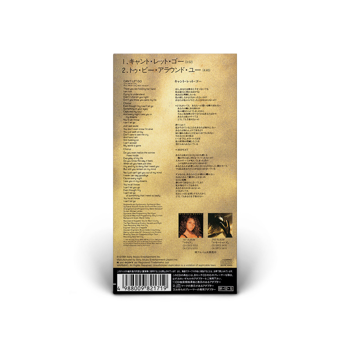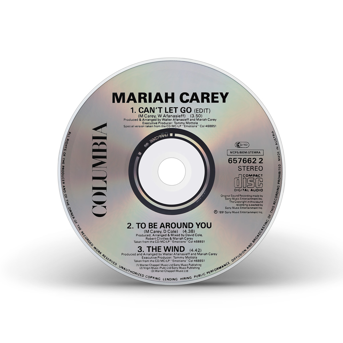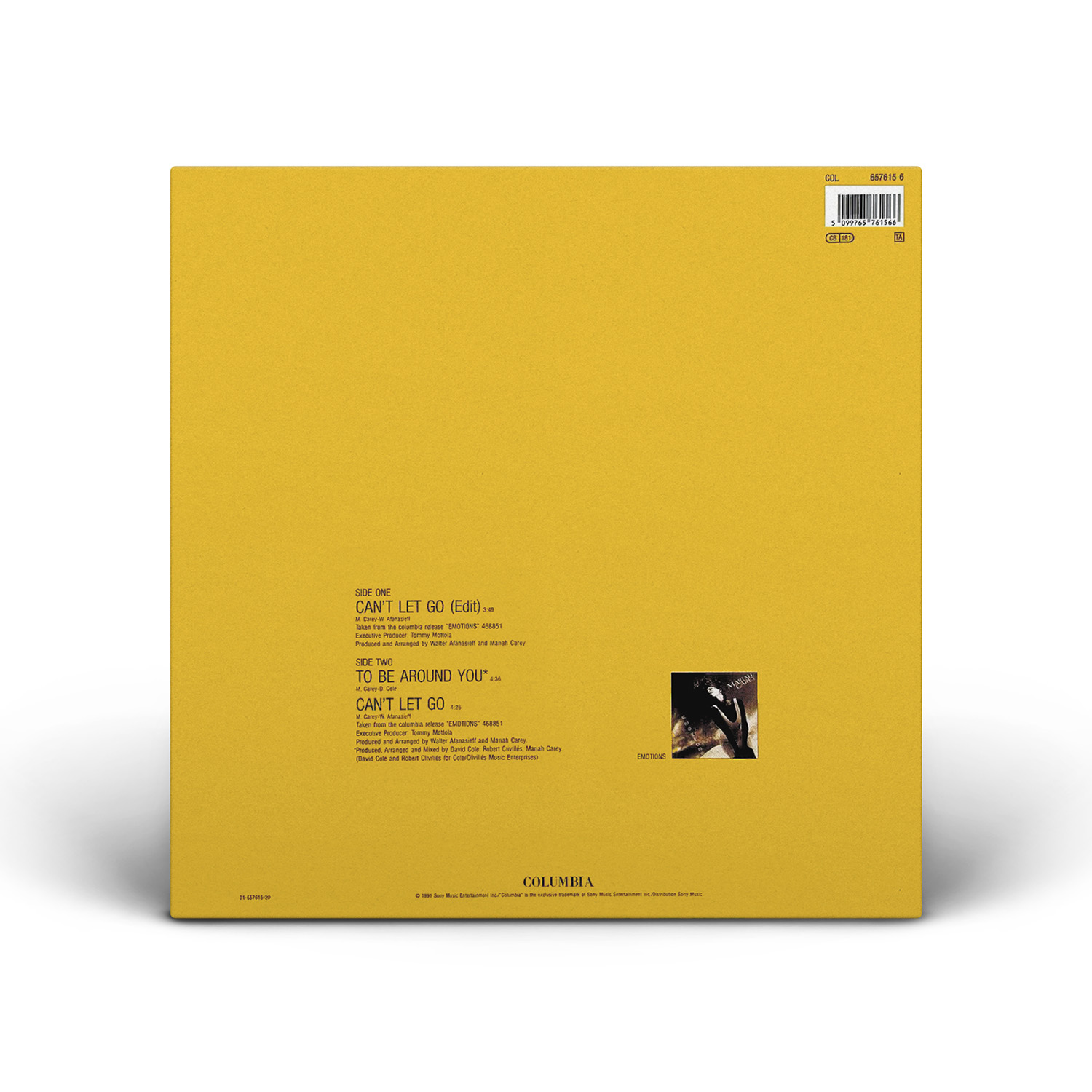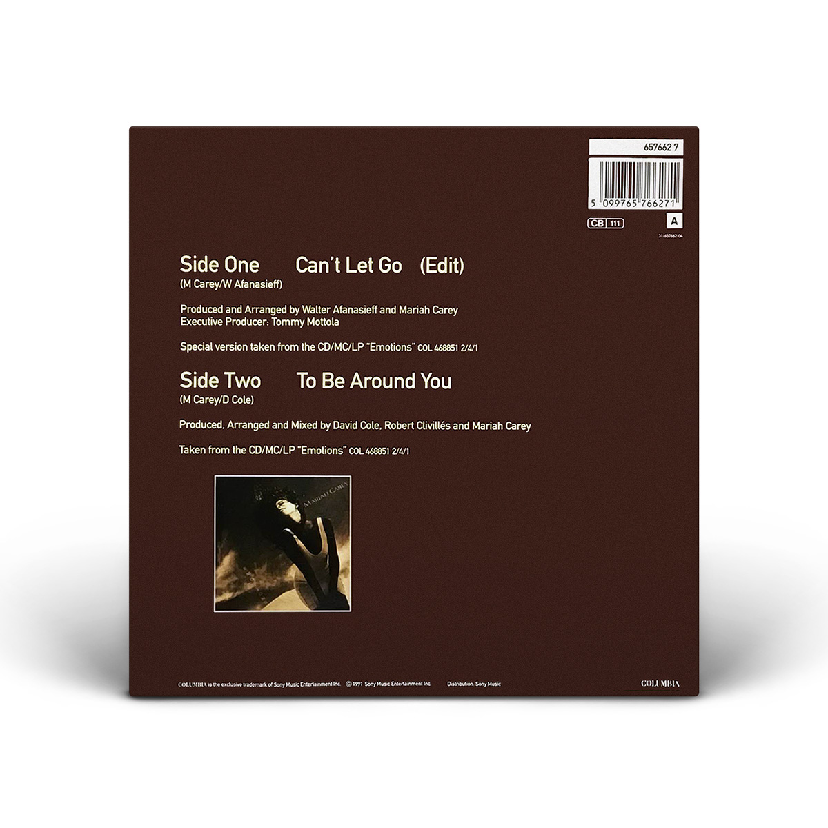 “Can't Let Go” was commercially released in the United Kingdom on December 2, 1991. CD 1 includes the Edit Version of “Can't Let Go” and two songs from the Emotions album: “To Be Around You” and “The Wind.” CD2 contains the Edit Version of “Can't Let Go” and two songs from Mariah's debut album: “I Don't Wanna Cry” and “All In Your Mind.” The Single, available on Cassette and 7" Vinyl, includes the Edit Version of “Can't Let Go” and “To Be Around You.”