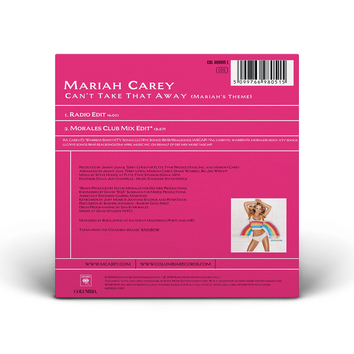 Released in Europe in late February 2001, the CD single includes the Radio Edit and the Morales Club Mix Edit of the song, while the CD Maxi single features three remixes by David Morales. “Can't Take That Away (Mariah's Theme)” was also released on 12" vinyl in Europe, including four Morales remixes as well as the album version of the song.