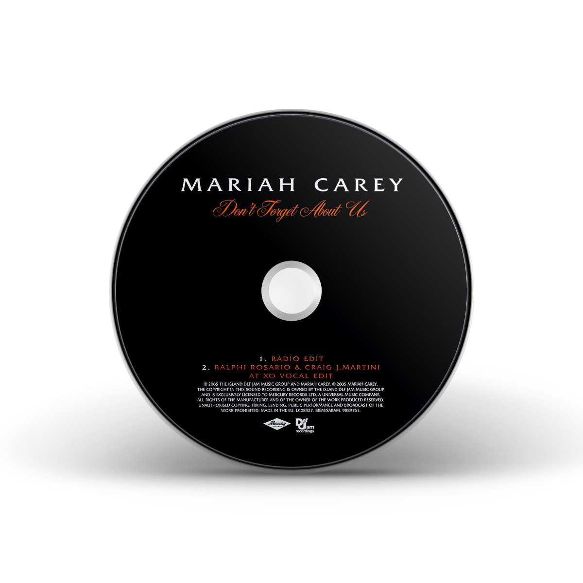 In Europe, the “Don't Forget About Us” CD Single includes the Album Version and the Remix featuring Juelz Santana and Bone Thugs-N-Harmony, while the CD Maxi Single includes the Ralphi Rosario & Craig J. Anthomic Vocal Mix and the Tony Moran Mix and the as well as the song's music video.