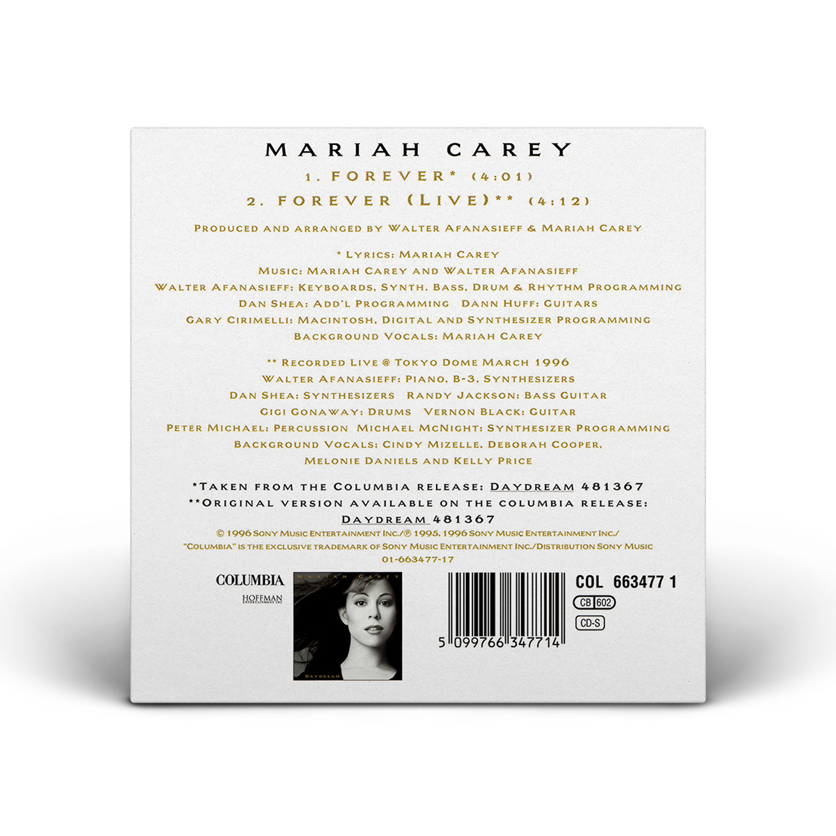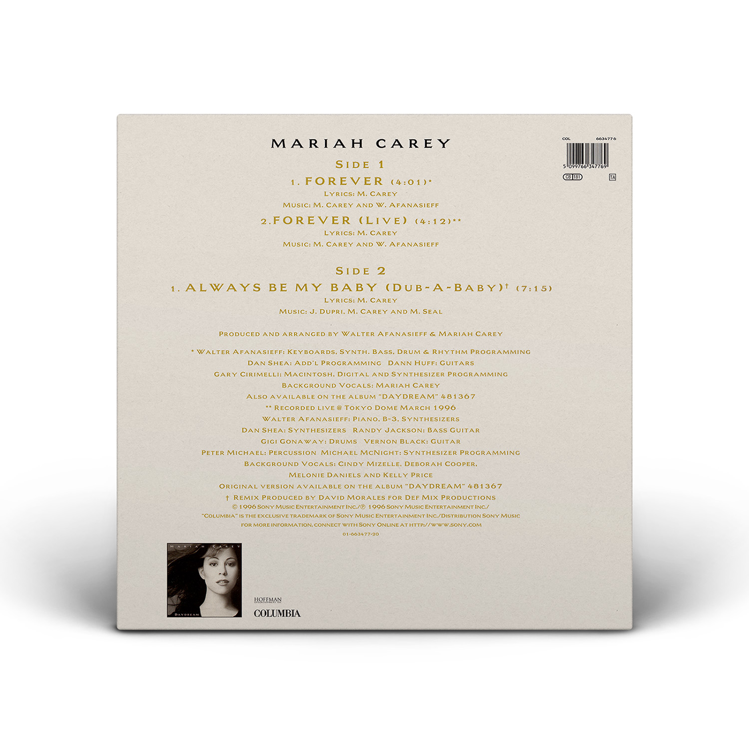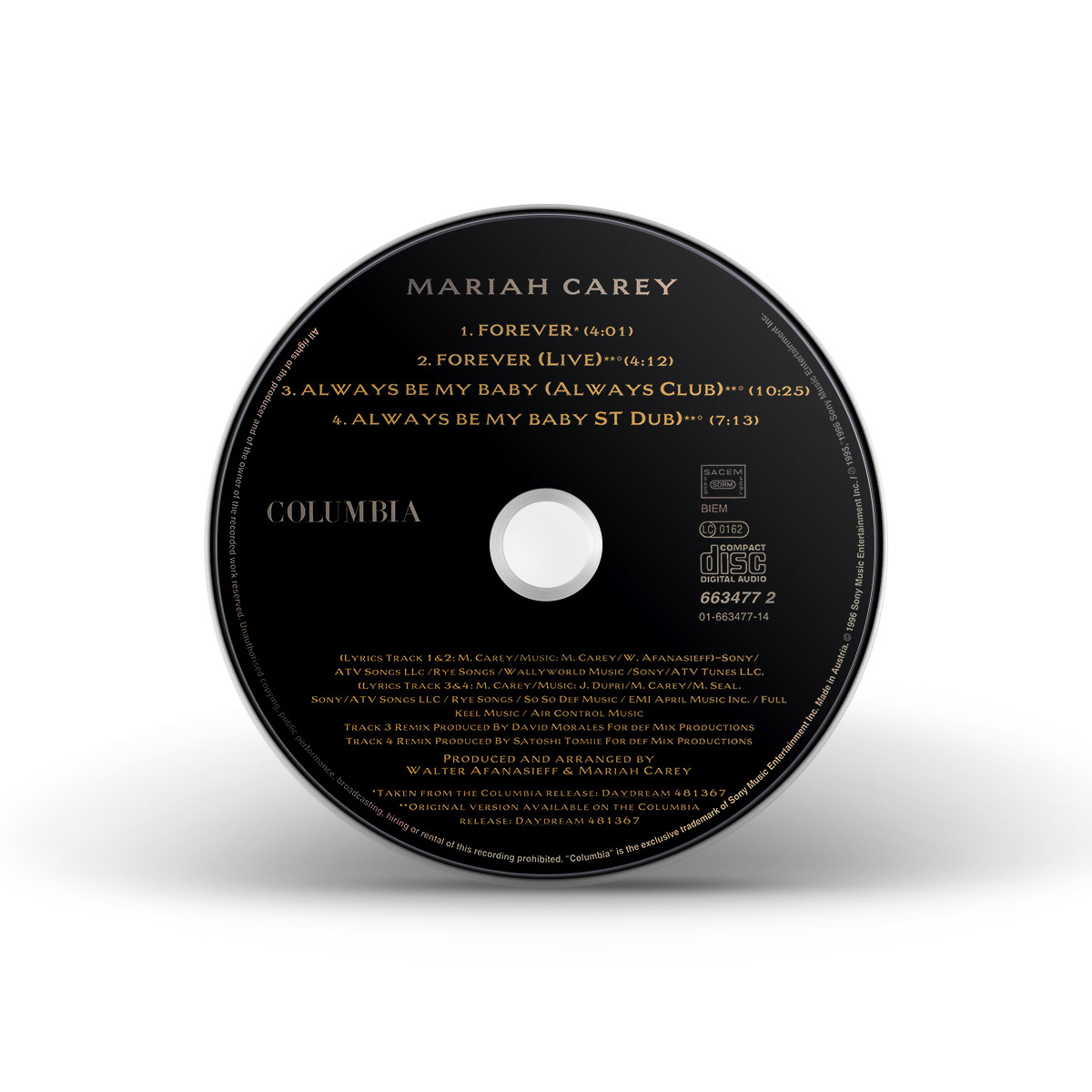 The “Forever” CD single released in Europe contains both the album version of the song and Mariah's performance at the Tokyo Dome during the Daydream Tour. The Maxi Single includes two additional remixes of “Always Be My Baby”: the Always Club Mix and the ST Dub. “Forever” was also released on vinyl, including the album version, the live version at the Tokyo Dome and the Dub-A-Baby remix of “Always Be My Baby.”