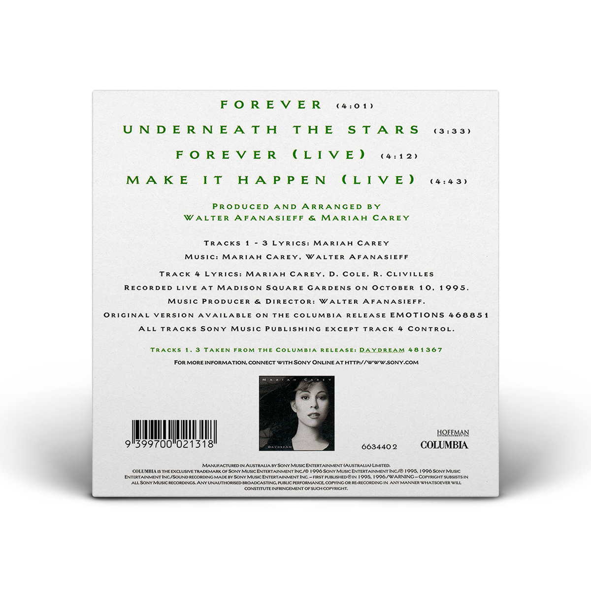 The Australian “Forever” Maxi Single, released on CD and cassette, includes the Album Version of “Forever” and “Underneath The Stars,” as well as the live versions of “Forever” from Mariah's Daydream tour in Tokyo and “Make It Happen” from Fantasy: Mariah Carey at Madison Square Garden.