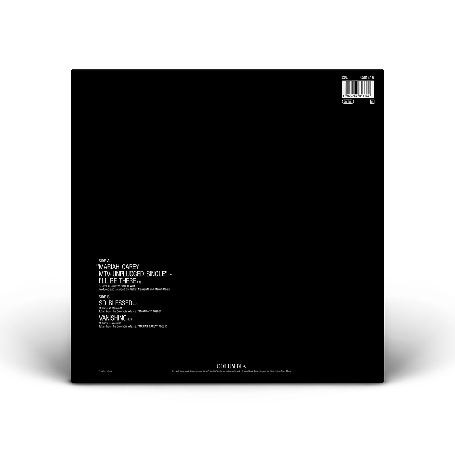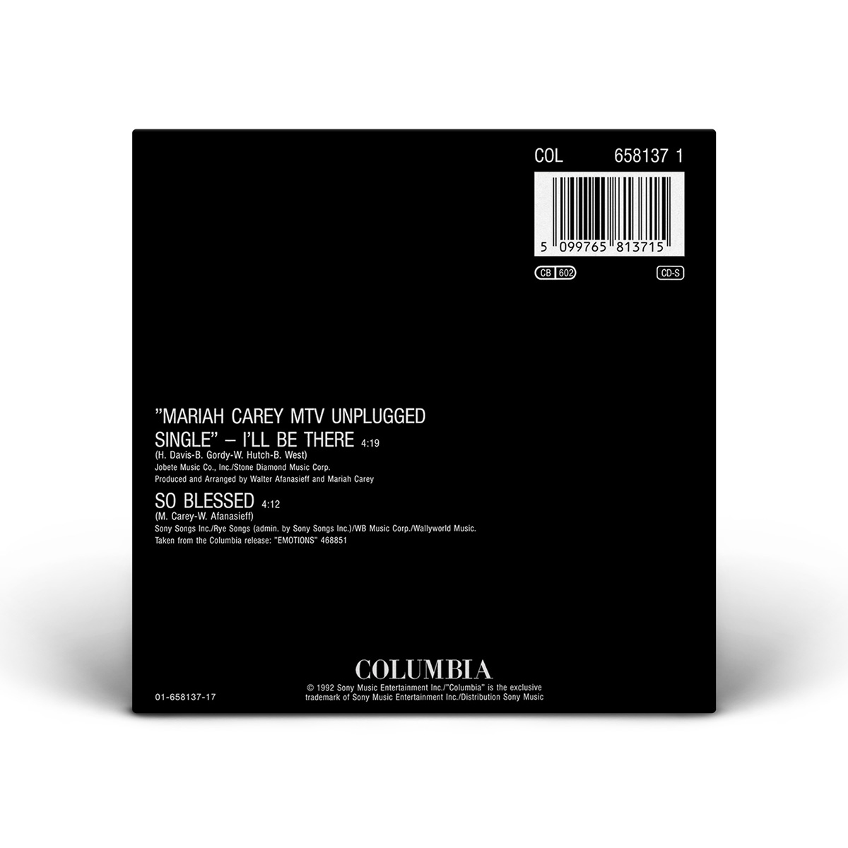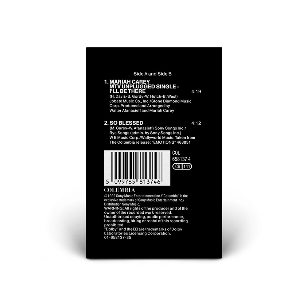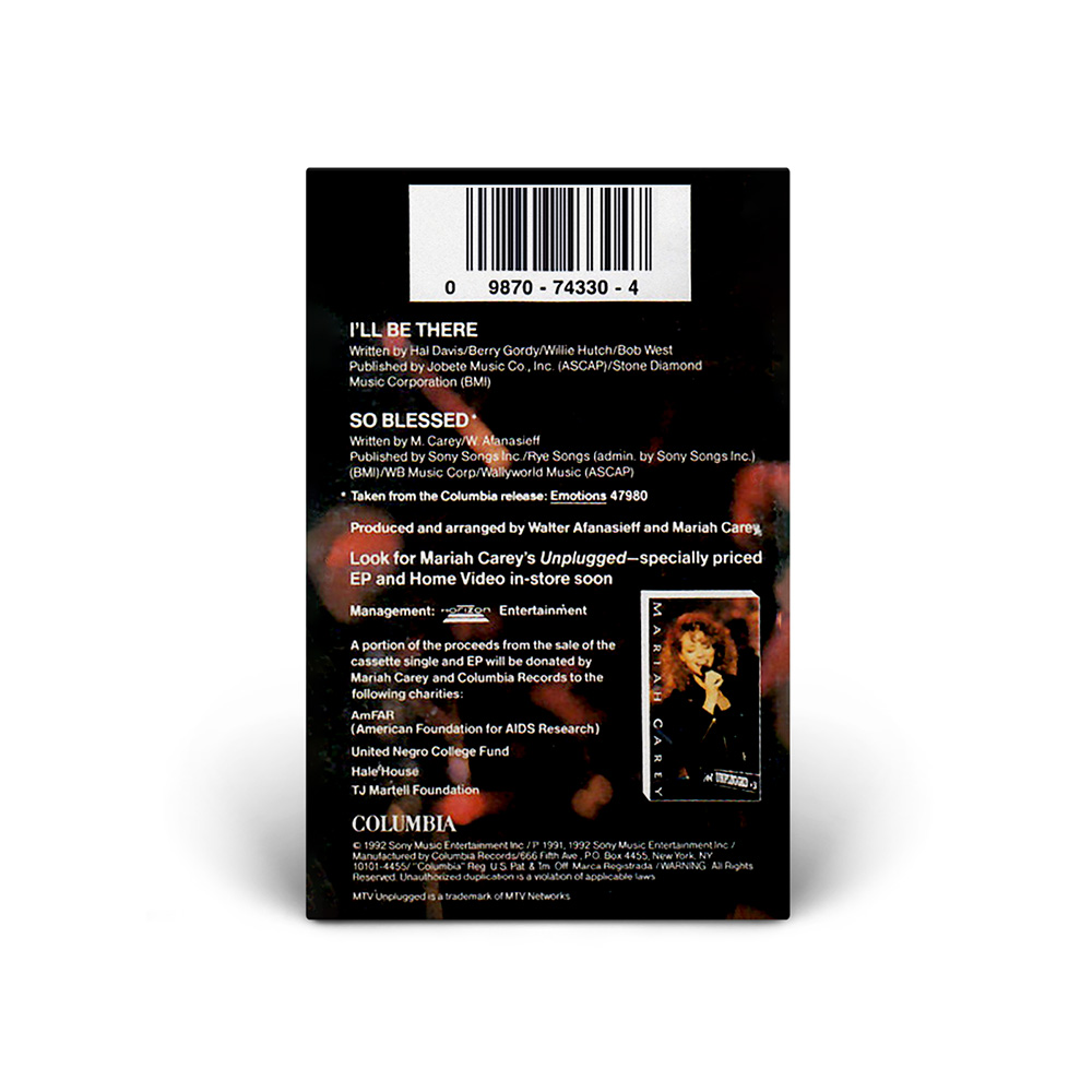 Two “I'll Be There” Maxi Singles were released in the UK on June 15, 1992. CD1 includes three additional ballads from Mariah's first two albums: “Love Takes Time” from Mariah Carey and “Can't Let Go” and “So Blessed” from Emotions. CD2 is limited edition picture CD which includes the live versions of “I'll Be There” and “Vision Of Love” from MTV Unplugged as well as “If It's Over,” from the Emotions album and “All In Your Mind,” from Mariah Carey. The “I'll Be There” single, available on 7" vinyl and cassette, included the song “So Blessed” as a bonus track.