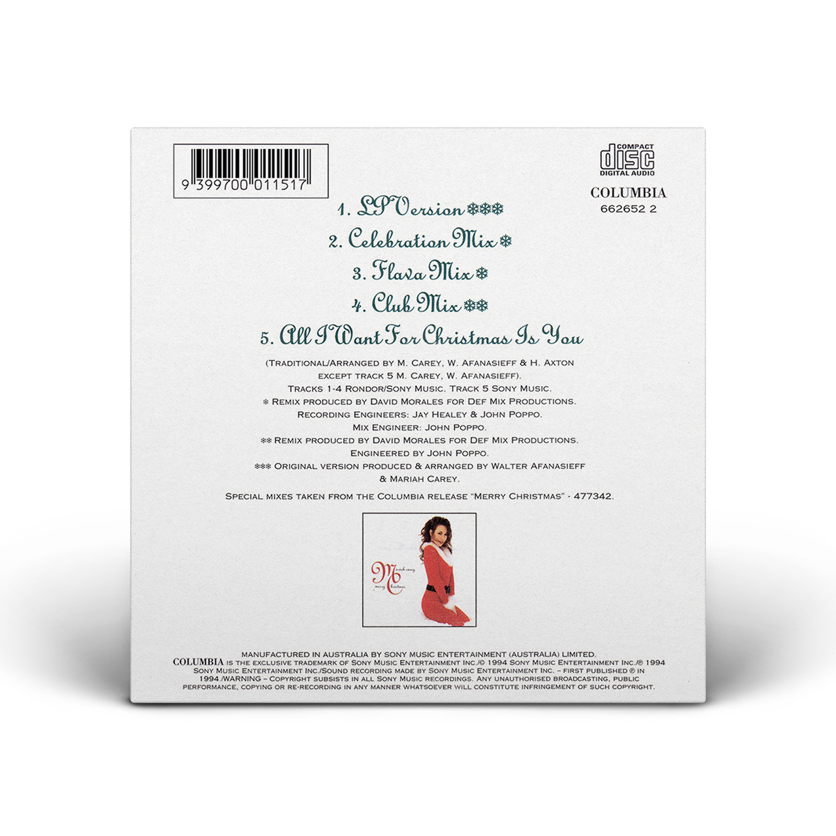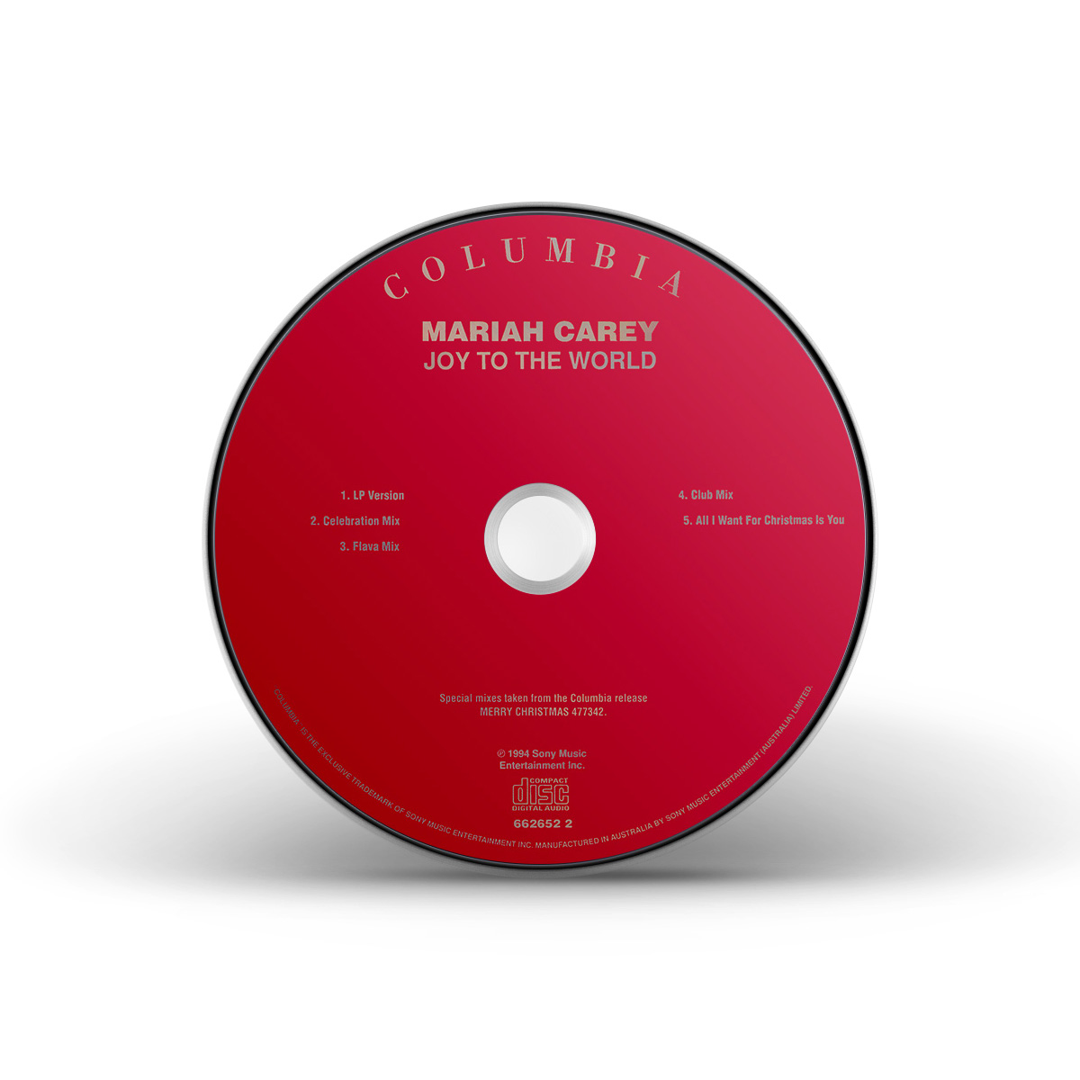 “Joy To The World” saw a commercial release in Australia. Available on CD and cassette, the Maxi Single includes the album version of “Joy To The World,” three remixes of the song produced by David Morales, and the album version of “All I Want For Christmas Is You.”