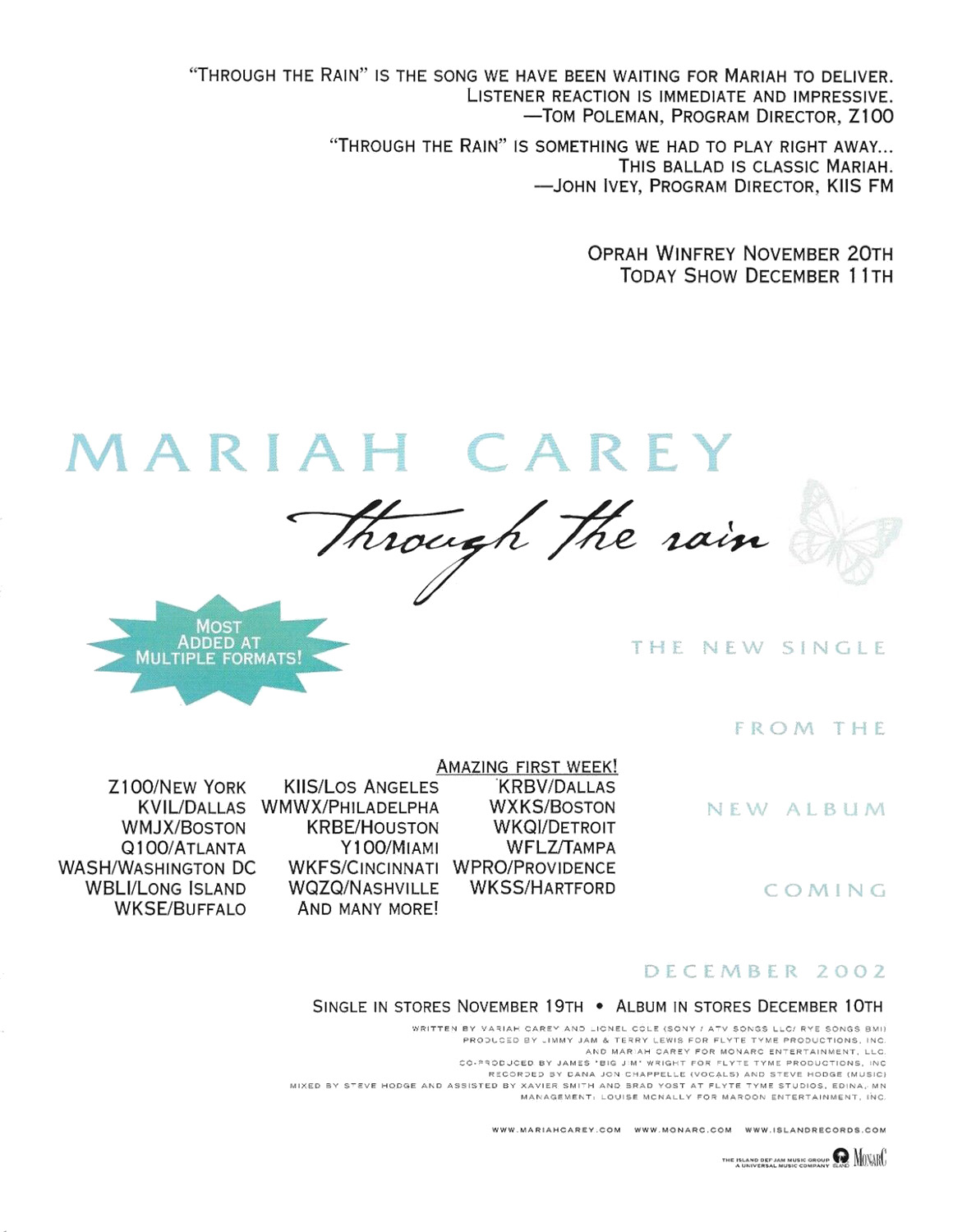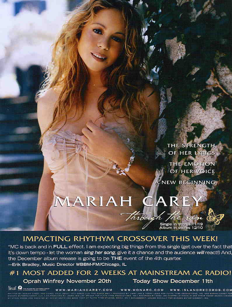 The “Through The Rain” music video, directed by Dave Meyers and filmed in New York City, stars actors Jamie-Lynn Sigler and J.D. Williams. “It's sort of Romeo and Juliet but it's set in the '60s and they're kind of torn apart,” Mariah said of the video's storyline. “It's about their struggle and I'm sort of the narrator. Something I could relate to, being the product of an interracial union, though [my parents] did not wind up happily ever after standing in church together.”
