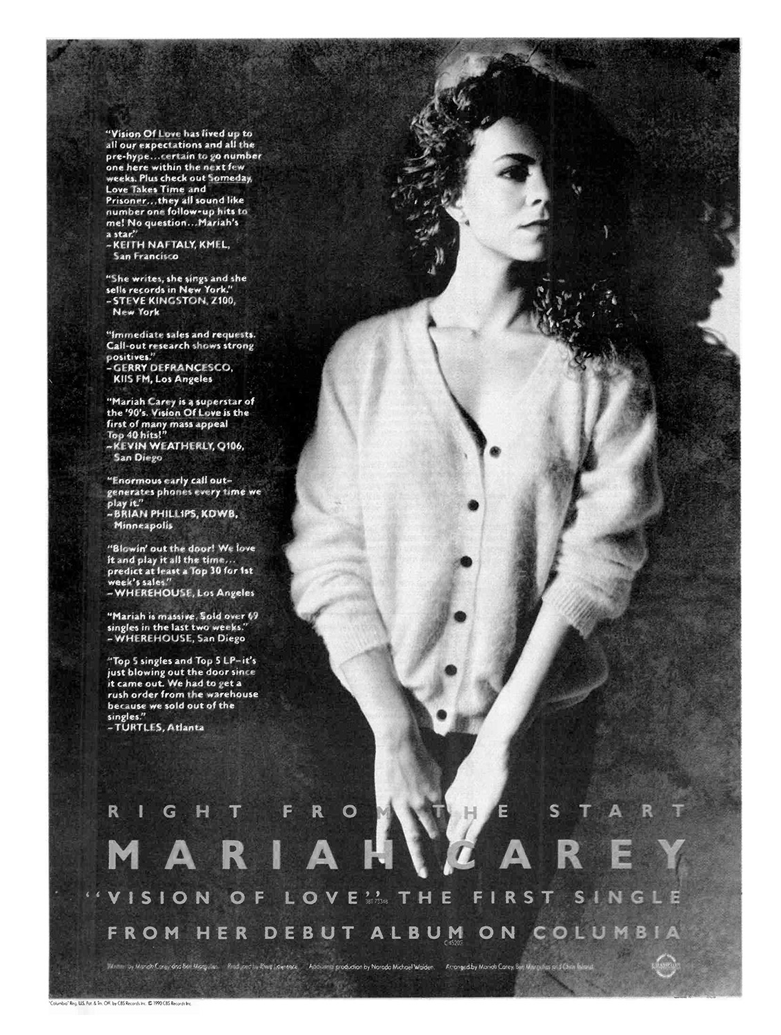 “Vision Of Love” was released as Mariah's debut single on May 15, 1990. “I wrote ‘Vision Of Love’ right after I signed my record deal with Columbia. It's a celebration of how I was feeling at the time and it's a very personal song,” Mariah said in 1991. “It's not really just a love song, it's about feeling good. I was at a very big turning point in my life at the time, so it's kind of about everything going on for me. I really didn't think that ‘Vision Of Love’ was going to be a big Pop hit because it wasn't like everything that was going on at the time — it wasn't a Dance record, it wasn't a Rap song, it wasn't Heavy Metal. It really didn't fit any particular format to me, and I was pleasantly surprise that it caught on the way it did. It makes me feel great because it's one of my favorite songs I've written.”