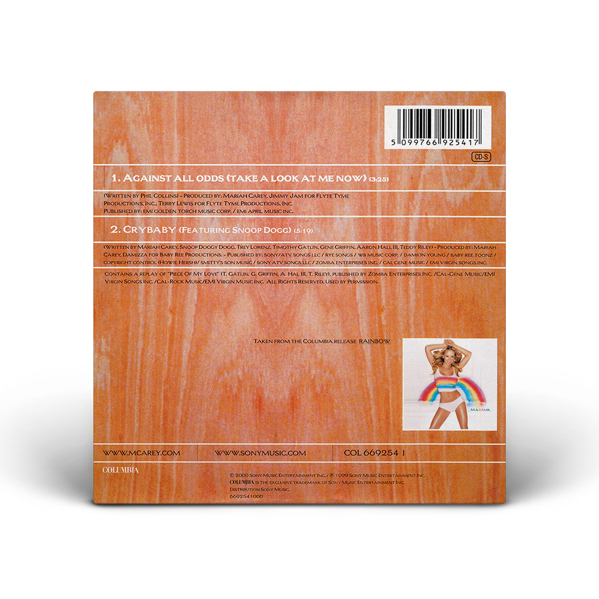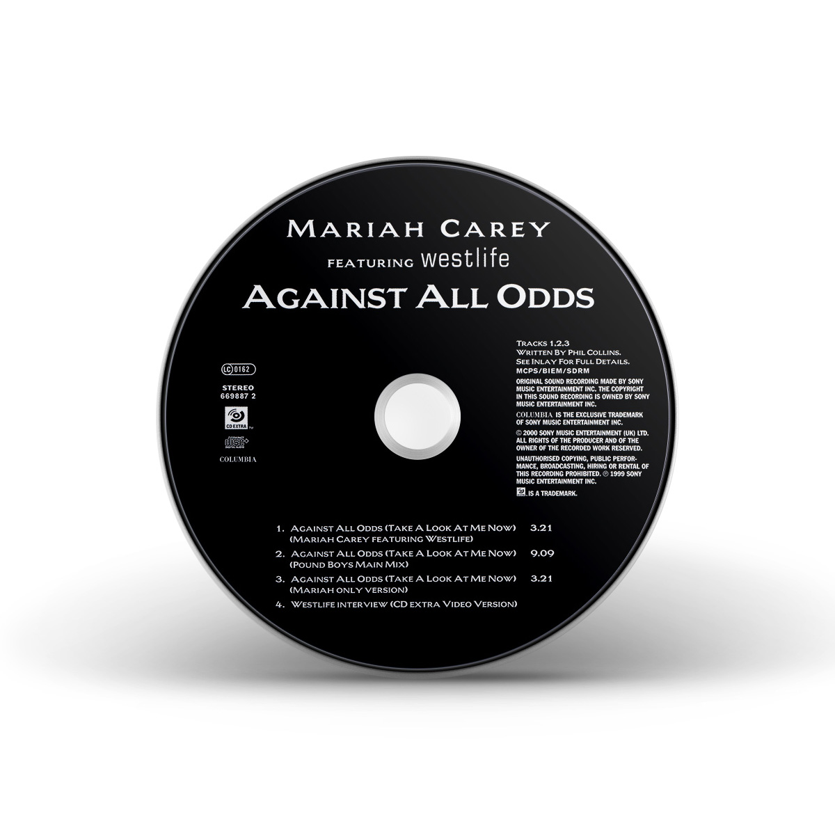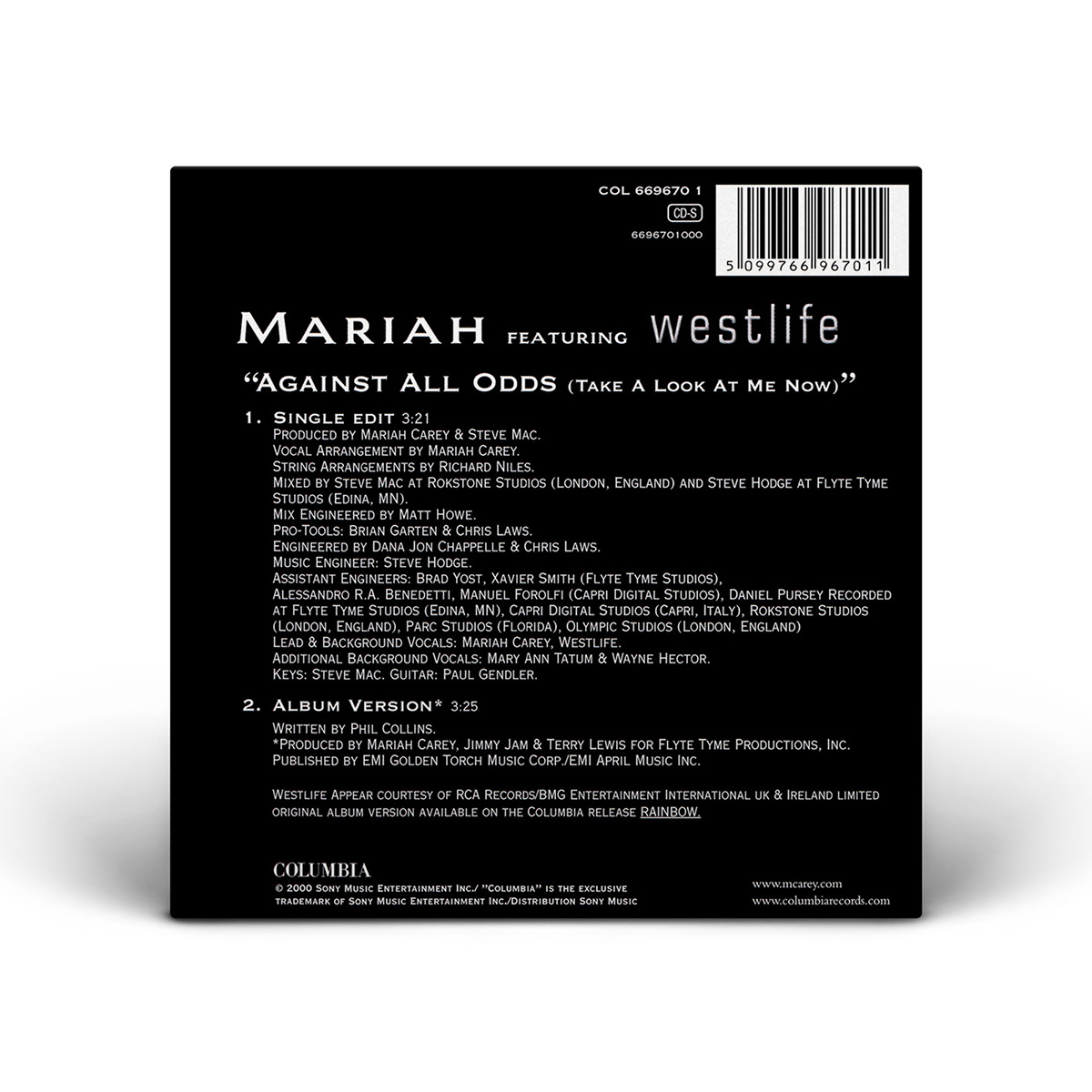 Mariah's cover of “Against All Odds (Take A Look At Me Now)” was released in Europe on May 29, 2000. The CD single features “Crybaby” as the B-side, while the Maxi Single also includes the StarGate Radio Edit of “Thank God I Found You” and the Morales Club Mix Edit of “Can't Take That Away (Mariah's Theme).” The duet version of “Against All Odds (Take A Look At Me Now)” with Westlife was later released on CD single, including the Rainbow album version of the song. The duet Maxi Single has an extra track: the Pound Boys Main Mix of the solo version of the song.