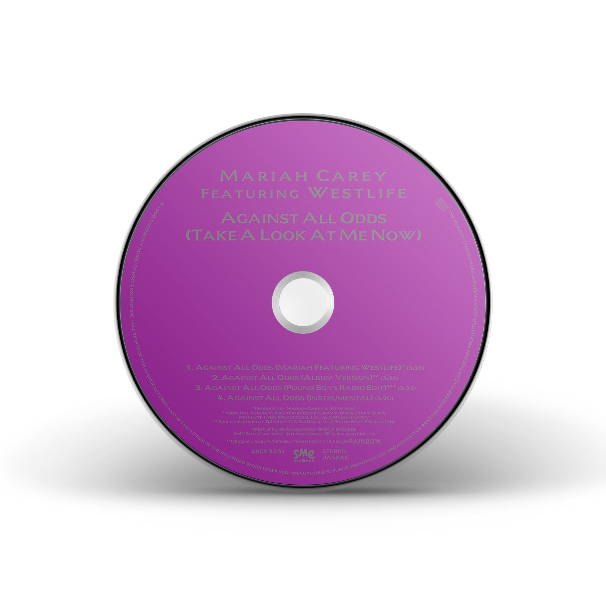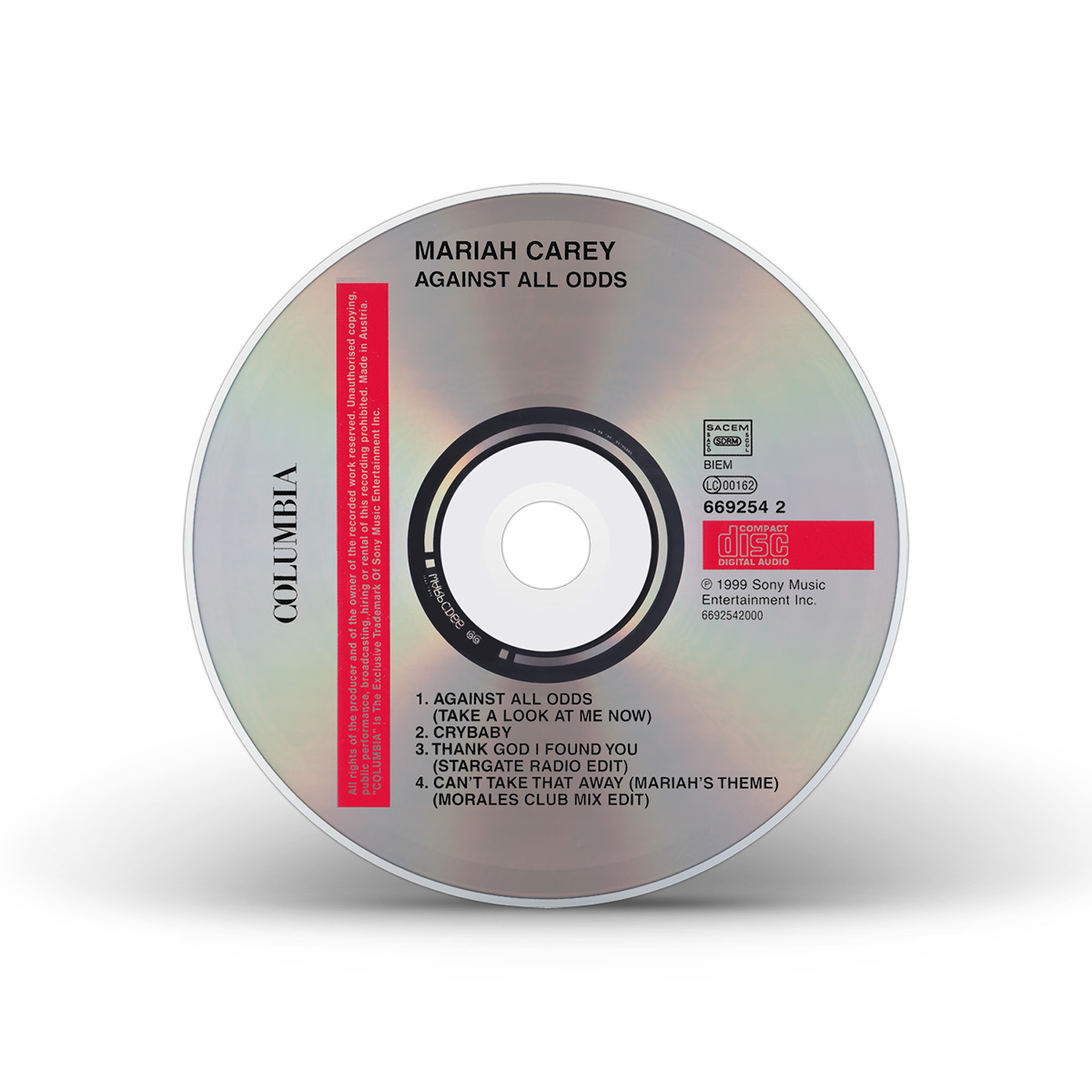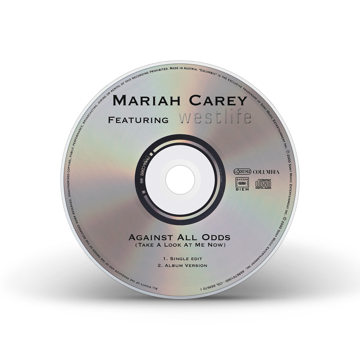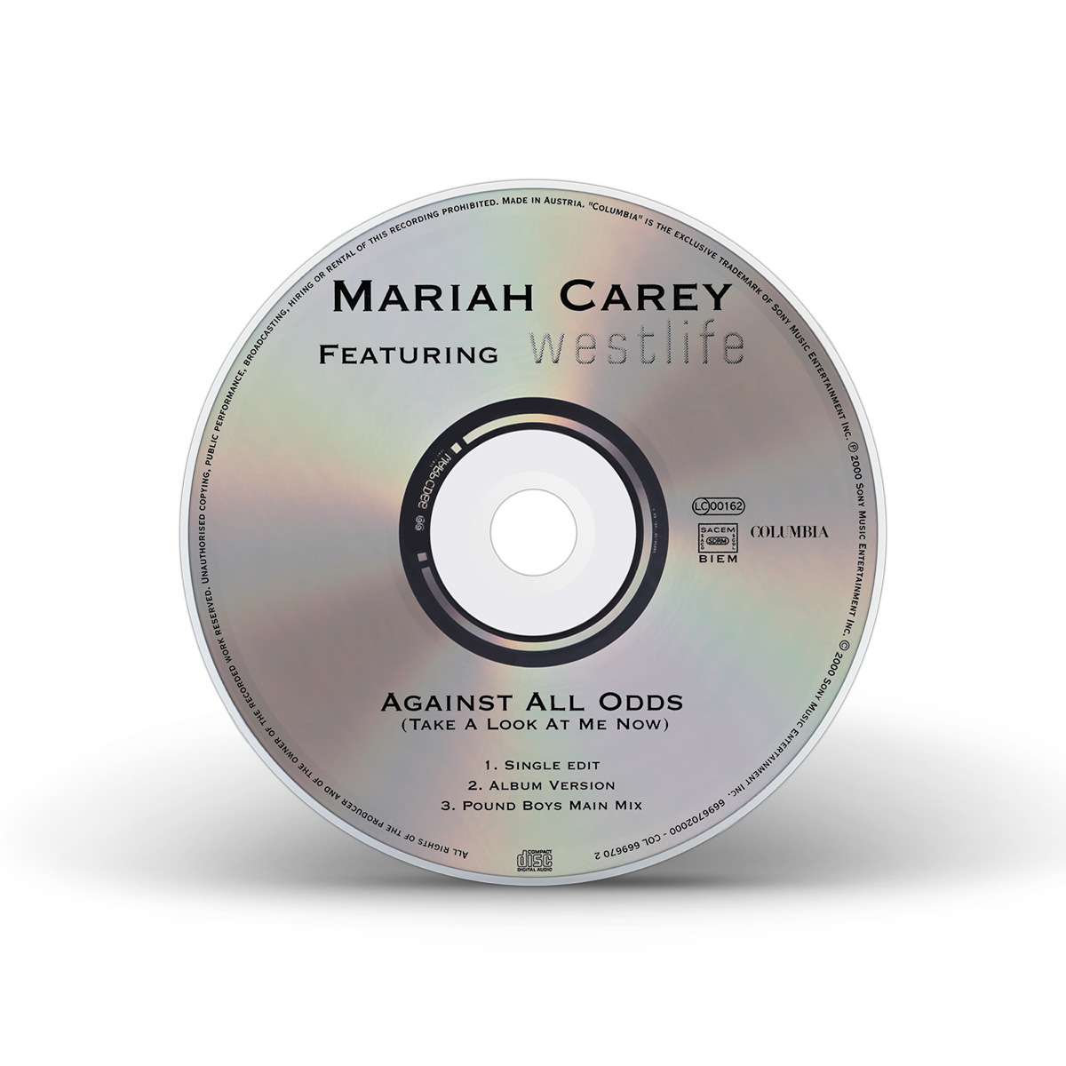 Mariah's cover of “Against All Odds (Take A Look At Me Now)” was released in Europe on May 29, 2000. The CD single features “Crybaby” as the B-side, while the Maxi Single also includes the StarGate Radio Edit of “Thank God I Found You” and the Morales Club Mix Edit of “Can't Take That Away (Mariah's Theme).” The duet version of “Against All Odds (Take A Look At Me Now)” with Westlife was later released on CD single, including the Rainbow album version of the song. The duet Maxi Single has an extra track: the Pound Boys Main Mix of the solo version of the song.