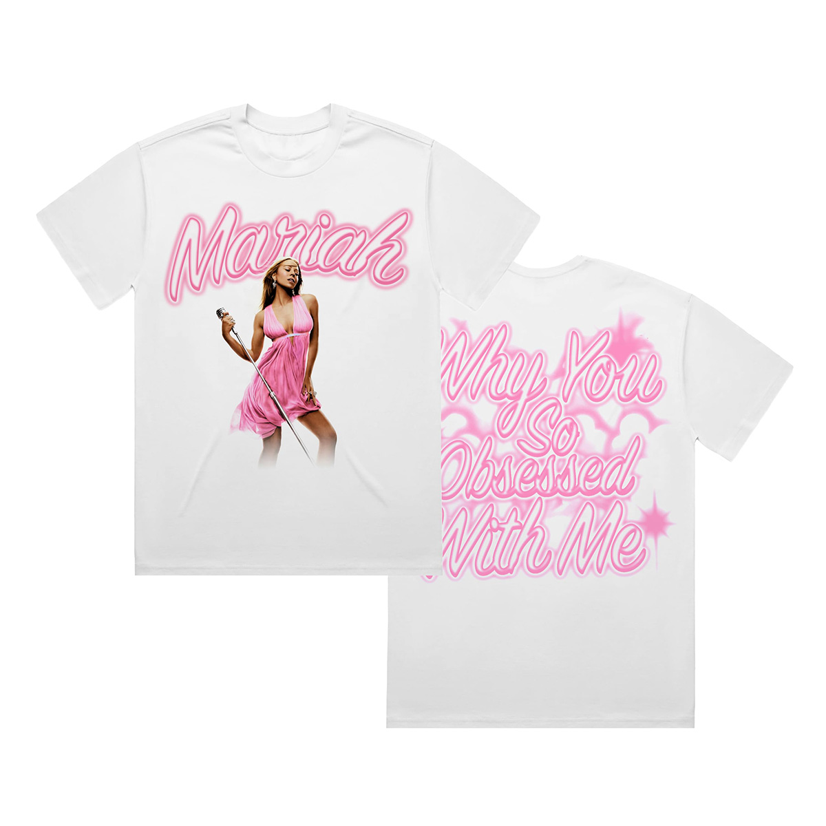 The Mariah Carey and Amazon Music merch collection celebrates Mariah's critically acclaimed album The Emancipation of Mimi, among other fan-favorite hits, featuring brand new designs across t-shirts, hoodies, hats, and special in-venue exclusives, including a Rainbow bedazzled denim jacket and a satin robe emblazoned with the lyric “Why You So Obsessed With Me.”