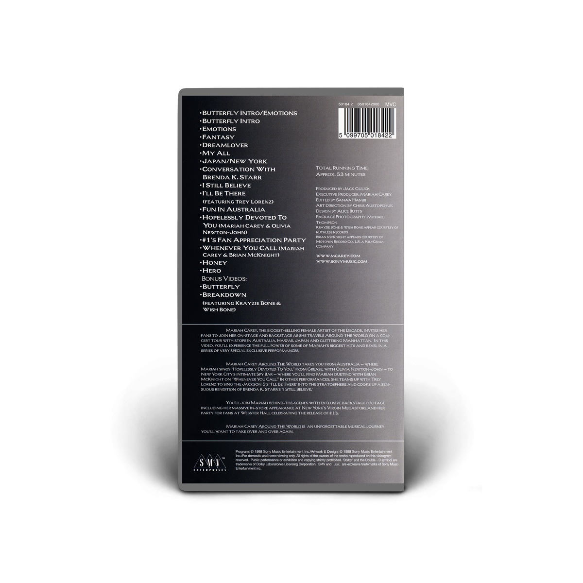 Around The World features footage from Mariah's 1998 Butterfly Tour, which visited Japan, Taiwan, Australia and Hawaii, and saw Mariah performing some of her biggest hits including “Fantasy,” “Hero,” “My All” and “I'll Be There” — including a very special performance of the song “Hopelessly Devoted To You,” from the Grease movie soundtrack, with Olivia Newton-John.