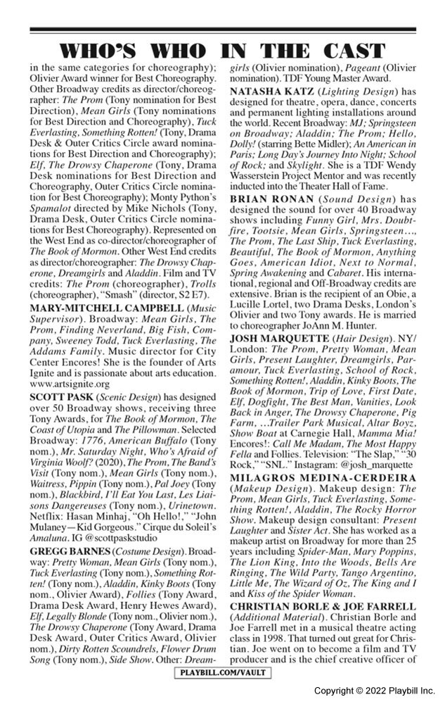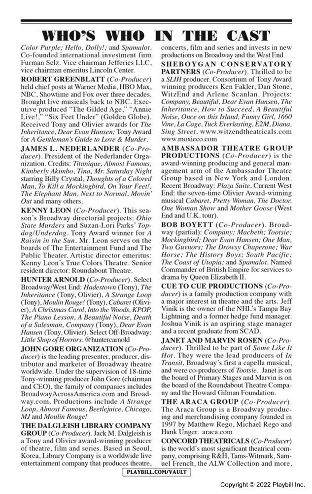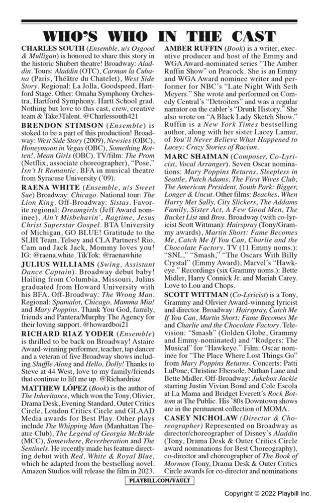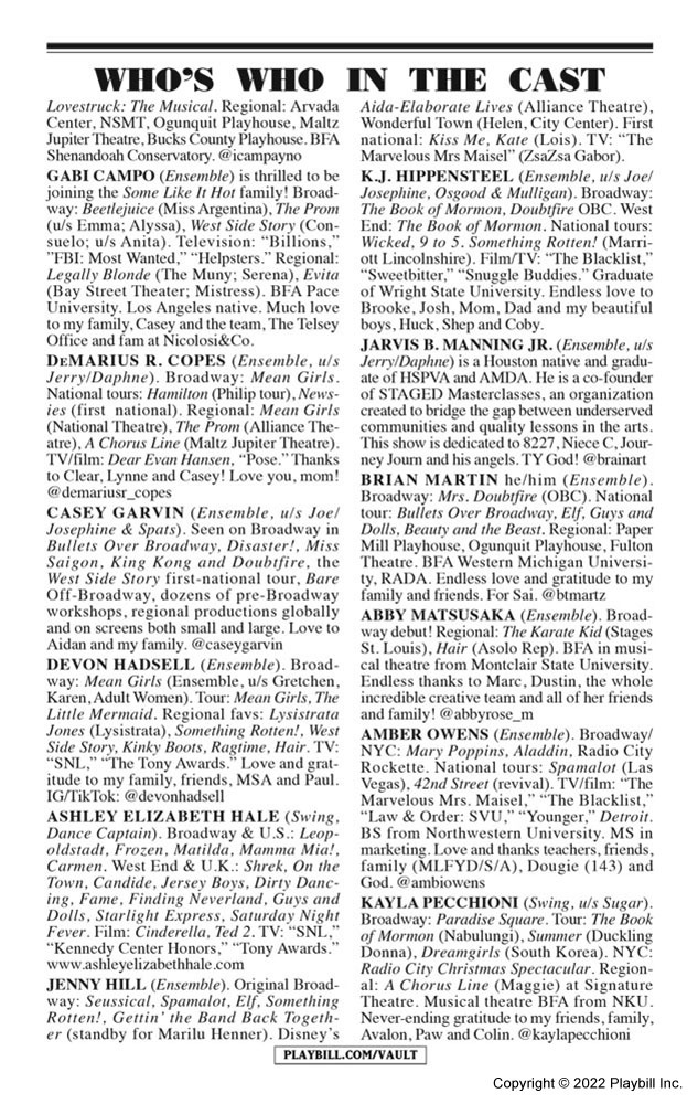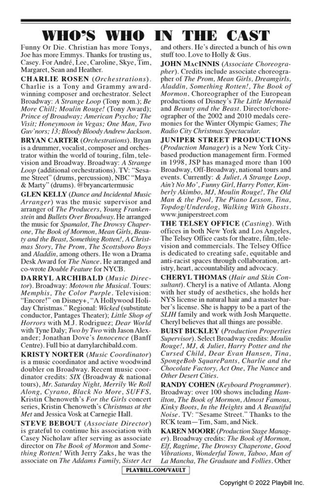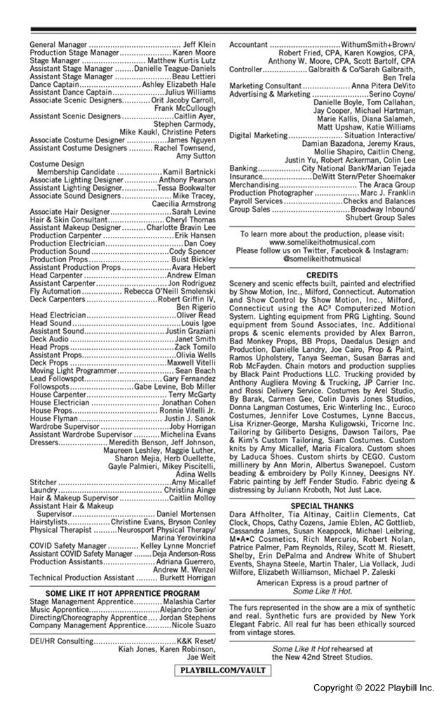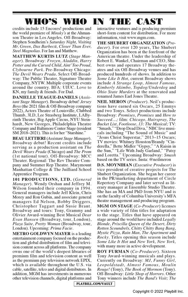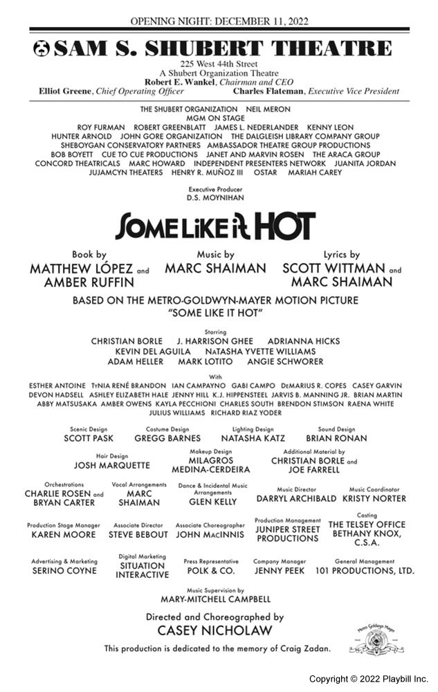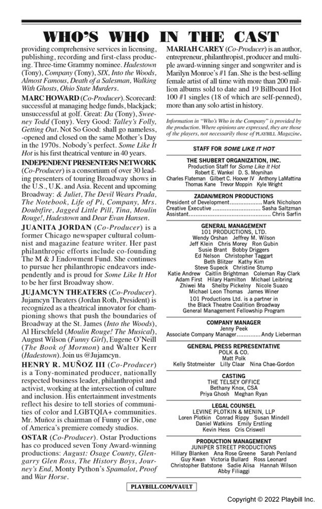 Mariah made her Broadway debut as one of the producers of the stage adaption of Some Like It Hot. Adapted from the 1959 film written and directed by Billy Wilder, Some Like It Hot opened at Broadway's Sam S. Shubert Theatre on December 11, 2022. The musical features a book by The Inheritance Tony winner Matthew López and Amber Ruffin and a score by Hairspray's Marc Shaiman and Scott Wittman, with Shaiman providing music and both contributing lyrics. Tony winner Casey Nicholaw directs and choreographs.